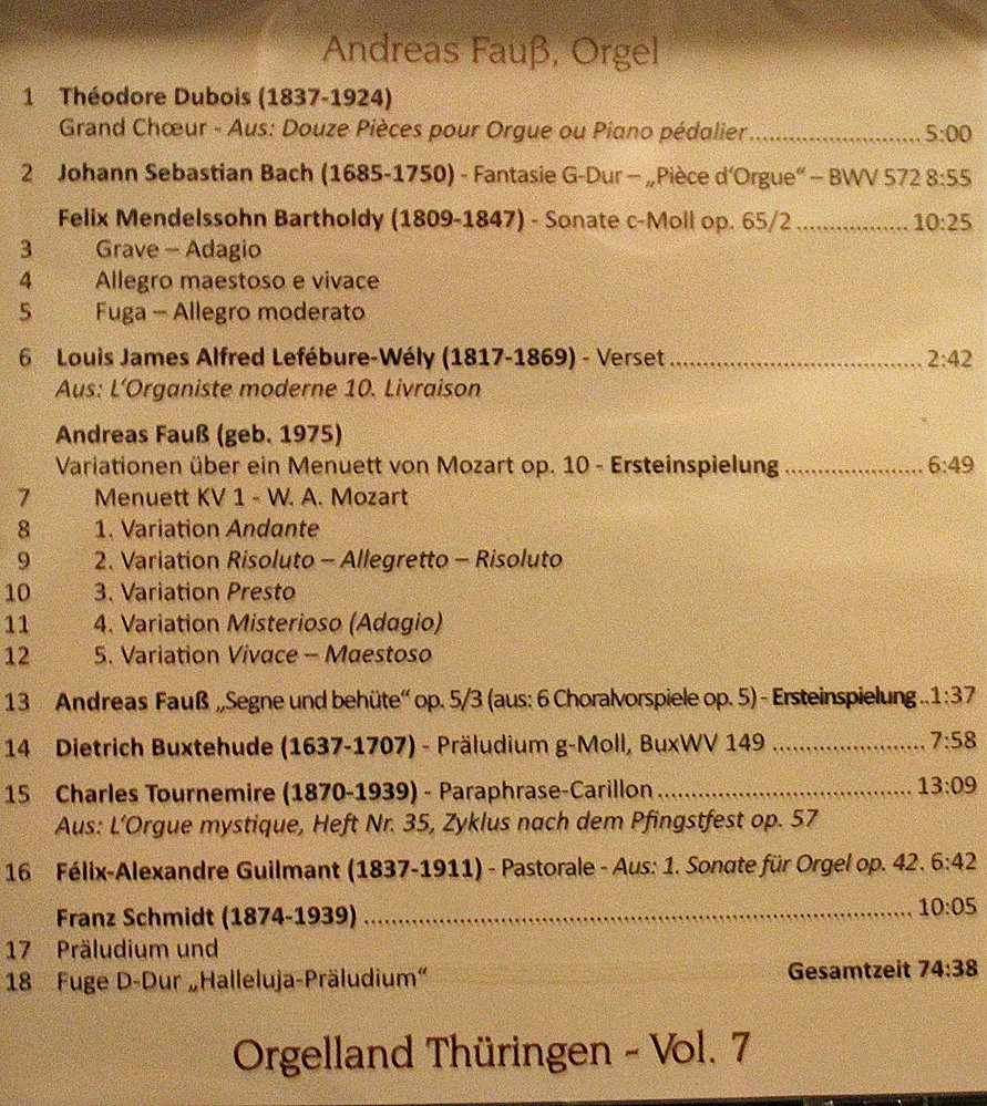 Eingespielt wurde unter anderem Werke von Théodor Doubois (1331-1924), Johann Sebstian Bach, Felix Mendelssohn Bartholdy (1809-1847), Louis James Alfred Lefébure-Wély (1817-1869), Andreas Fauß (geb. 1975) mit Variationen über ein Menuett von Mozart op. 10 in einer Ersteinspielung, Dietrich Buxtehude (1637-1707) und Charles Tournemire (1870-1939).