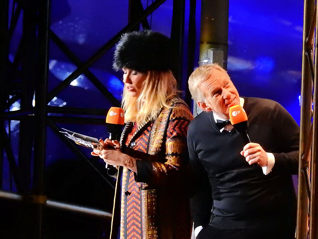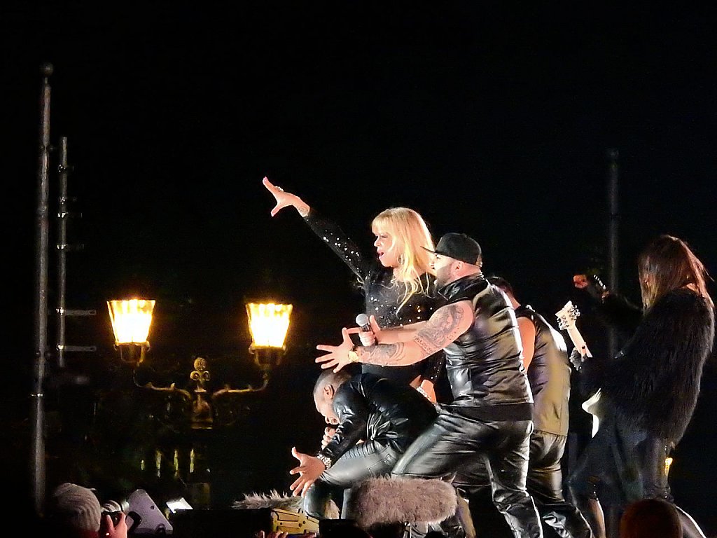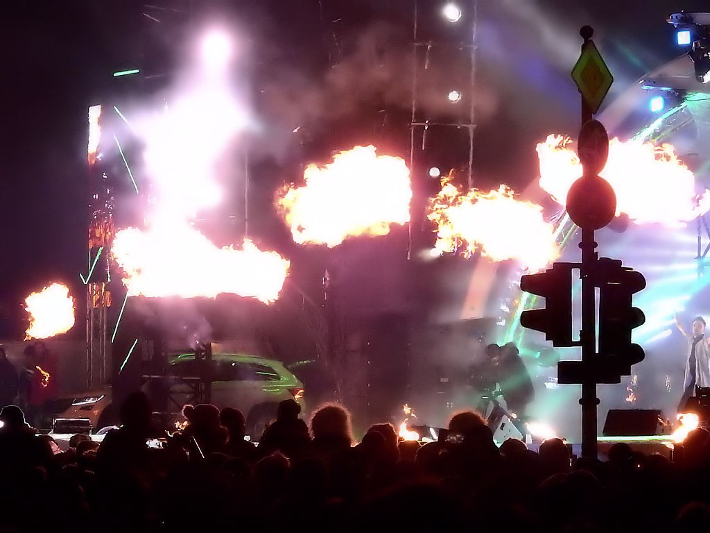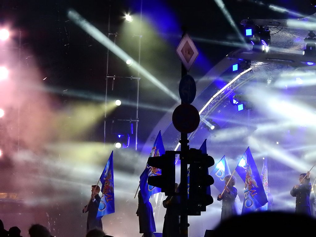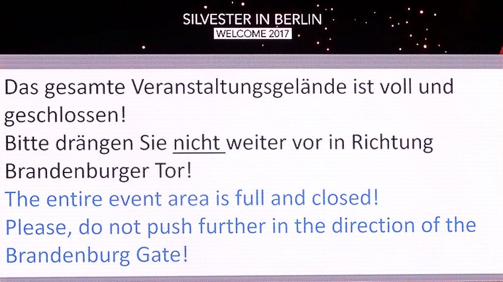 Auf der Bühne probte man den Countdown für den Jahreswechsel. Andrea Kiewel und Johannes B. Kerner moderierten für das ZDF durch den Abend. Gegen 21.00 begann mein zweiter Kampftag auf den Festgelände. Nach dreimaligen Kontrollen gelangte ich endlich auf den Festplatz. Es war natürlich rappelvoll. 21.30 erschien auf den vielen Anzeigen ein Hinweis, dass fast alle Eingänge gesperrt werden - wegen Überfüllung. Die Polizei teilte mit, dass rund 500.000 Gäste am Brandenburger Tor sind.
