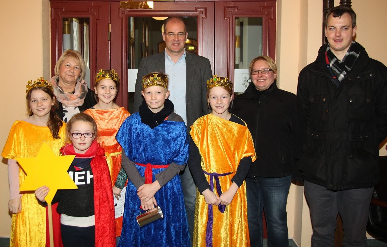 Mit seinen Sternsingerkollegen Leni, Fiona, Marie und Josephine war Johannes heute Mittag im Landratsamt und sie haben Landrat Matthias Jendricke und der Beigeordneten Hannelore Haase stellvertretend für die Landkreisverwaltung ihren Segen überbracht. Die Dritt- und Viertklässler aus der Evangelischen Grundschule haben heute ihre ersten Station in der diesjährigen Sternsingeraktion.