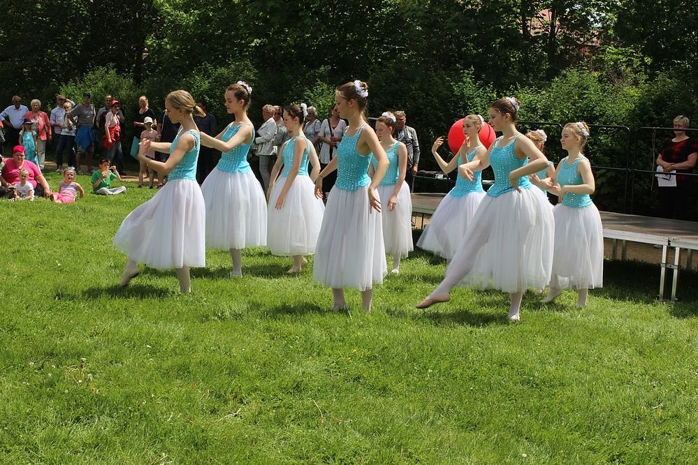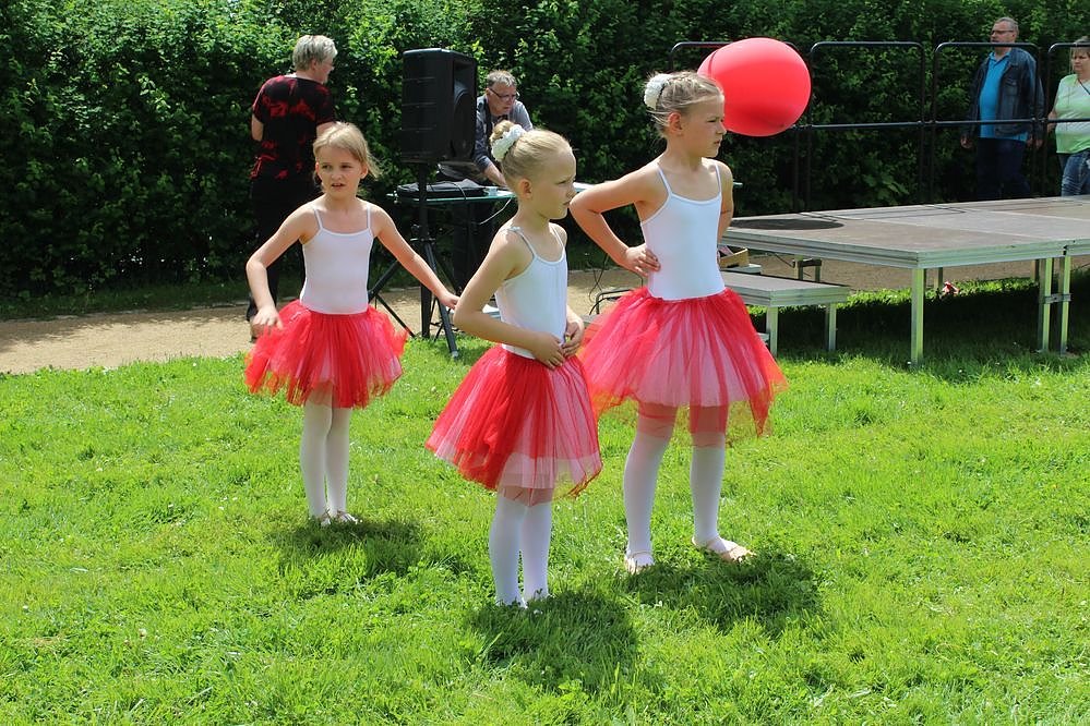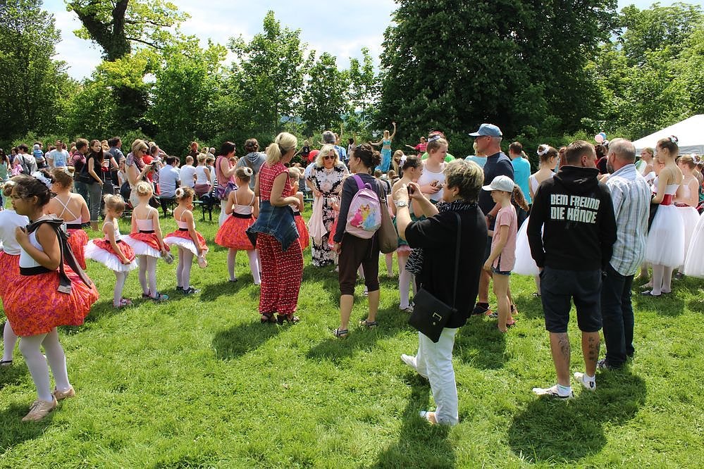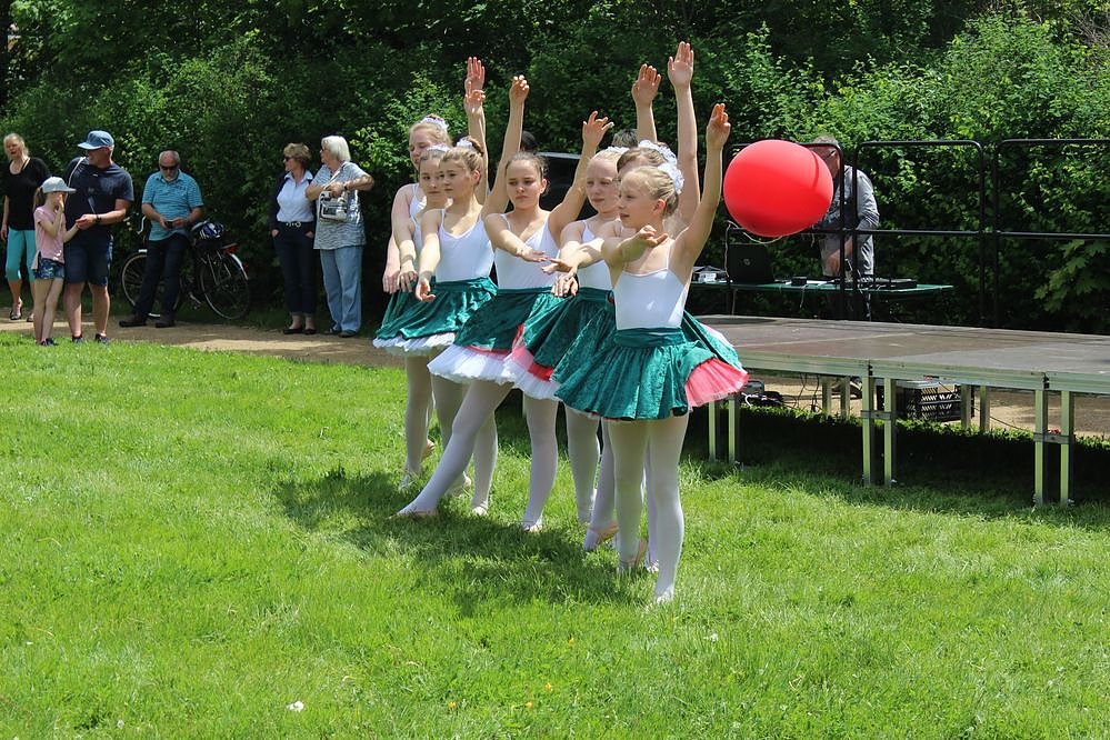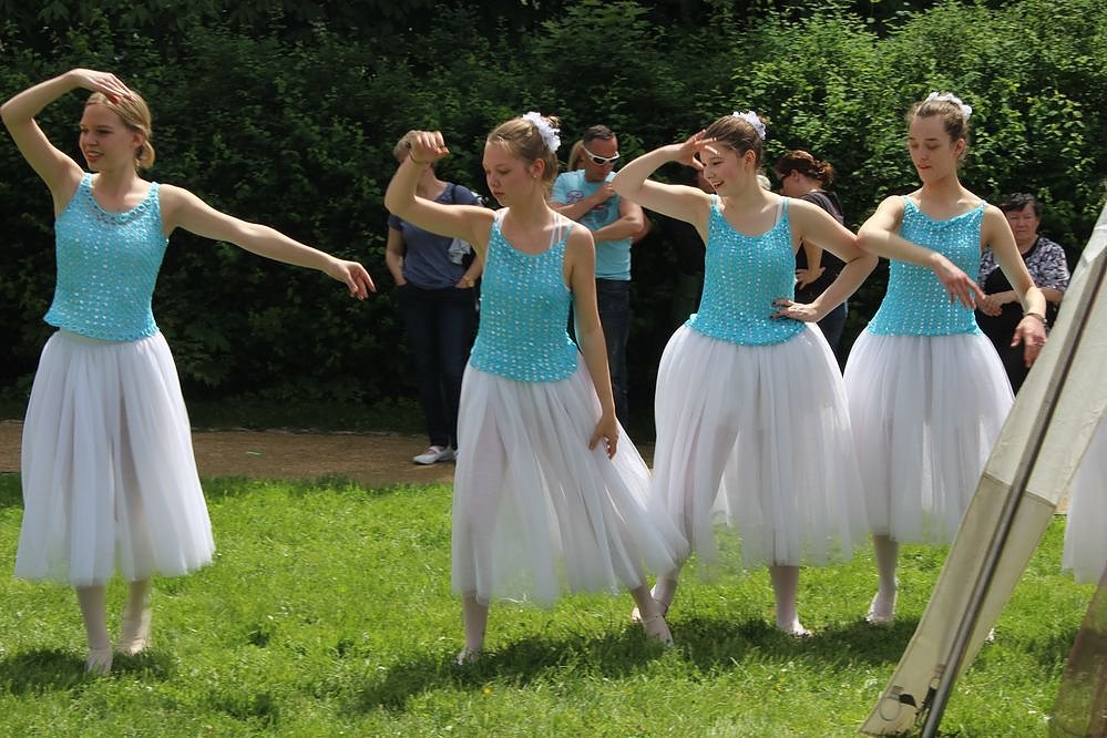 Die Mädchen mussten im Gras tanzen. Leider war es durch die Regenfälle der letzten Tage schnell gewachsen und so stand es recht hoch. Die Mädchen meisterten es mut Bravour. Aber man hätte wenigstens vor der Bühne nochmals mit dem Rasenmäher darüber gehen können, meinten einige Besucher gegenüber kn.