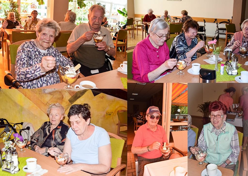 Bei unserem ersten Eisnachmittag in diesem Jahr, ließen sich die Bewohnerinnen und Bewohner, am vergangenen Mittwoch, im Speisesaal und auf unserer Sonnenterrasse, die verschiedenen Eiskreationen von Murano in liebevoll zusammengestellten Eisbechern, auf der Zunge zergehen.