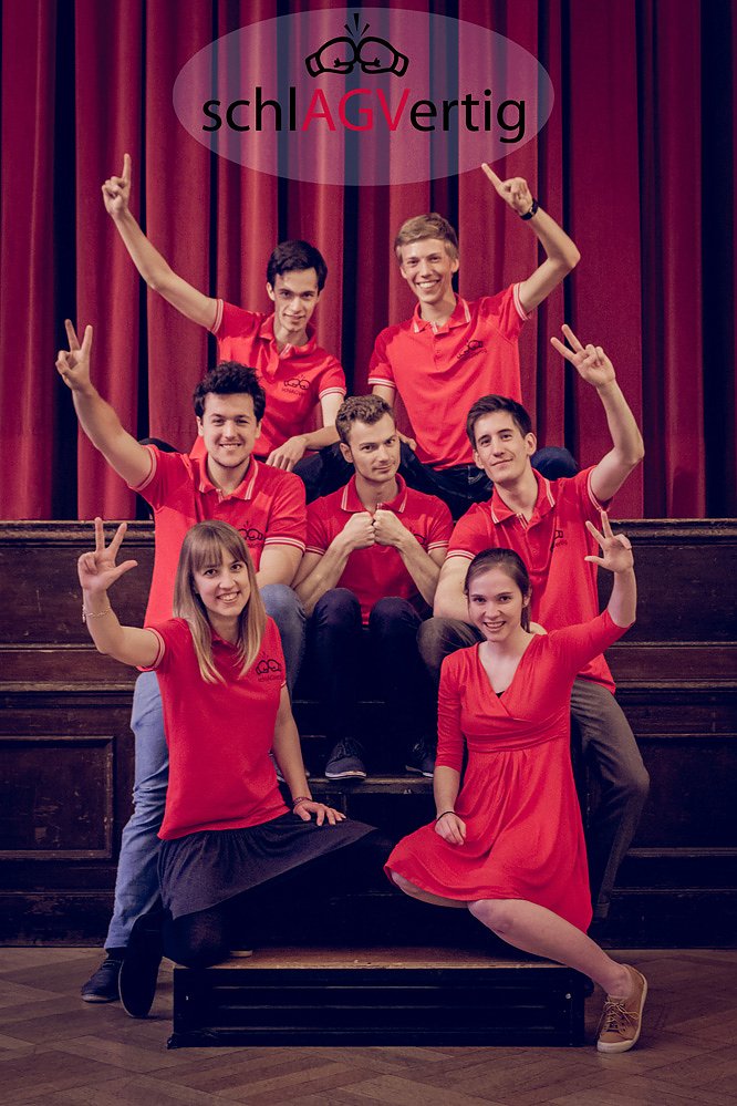 seit 2012 gibt es im Akademischen Gesangverein München (AGV) eine Musengruppe für Improvisationstheater. Das feste Team schlAGVertig umfasst zehn Mitglieder und tritt mindestens einmal im Monat auf. In unseren Reihen sind sowohl Schauspieler als auch drei Musiker, die das Geschehen auf der Bühne musikalisch untermalen. Jedes Semester veranstalten wir ein Improtheatermatch. Dazu laden wir uns andere Impro-Teams aus ganz Deutschland ein, die gegen uns antreten. Bei diesem Wettstreit gibt das Publikum vor, was auf der Bühne szenisch gespielt, erzählt oder pantomimisch dargestellt wird. Der Wettstreit steht dabei im Hintergrund, wichtig ist der gemeinsame Spaß der Gruppen und des Publikums.