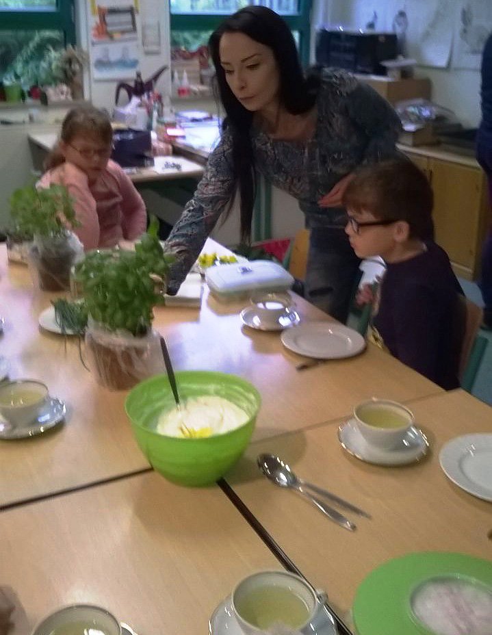So wurde die Frühstückspause zu einem spannenden Erlebnis, in der die Kinder nicht nur Petersilie, Basilikum und Schnittlauch verkosteten. Wildkräuter, wie Giersch und Vogelmiere, die häufig im heimischen Garten als unliebsames Unkraut beseitigt werden, wurden mit allen Sinnen erlebt und eine Ähnlichkeit im Geschmack zu bekannten Kräutern festgestellt. Besonders mutig zeigten sich die Schüler im Umgang mit der Brennnessel, die sie anfassten und auch geschmacklich probierten. Durch die Verwendung frischer Blüten von Ringelblume und Kapuzinerkresse sowie einer kleinen Prise von Lavendelsalzes wurde der frische Quarkaufstrich und das selbstgebackene Brot zum farbenfrohen Augen- und Gaumenschmaus. So gut hat uns Quark noch nie geschmeckt! lautete die einstimmige Meinung der Kinder.