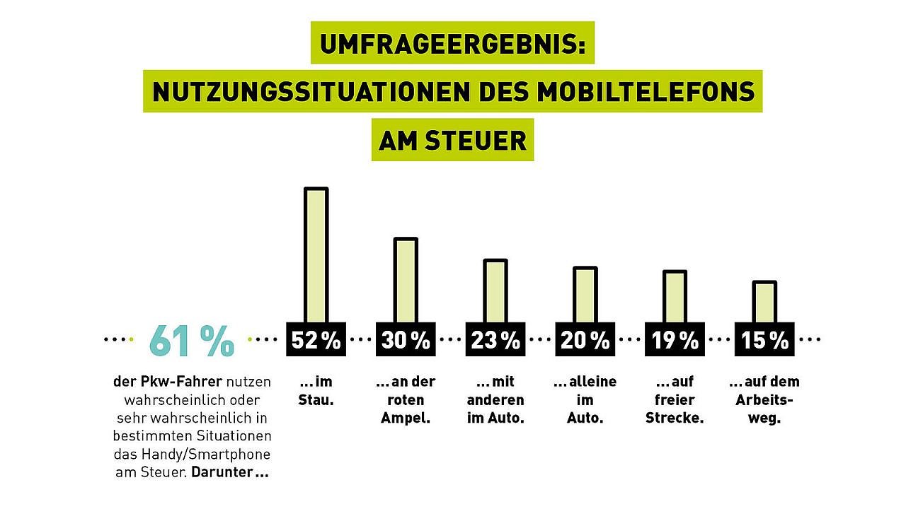 Ein Großteil der Fußgänger nutzt das Mobiltelefon im Straßenverkehr Fast zwei Drittel der Fußgänger (63 Prozent) gaben in der Kantar-TNS-Umfrage zu, das Smartphone oder Handy im Straßenverkehr zu nutzen. Wenn Fußgänger im Straßenverkehr zum Mobiltelefon greifen, dann vor allem zum Telefonieren ohne Freisprechanlage (58 Prozent*) und zum Lesen (44 Prozent*) oder Schreiben (34 Prozent*) von Textnachrichten.