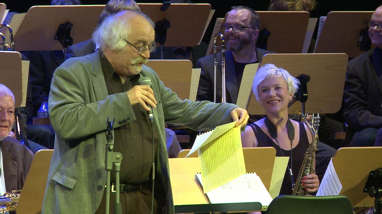 Die Musik sollte sich denn auch im Laufe des Abends über das weitere Haus verteilen, zunächst aber gab es erst einmal ein kleines Novum: statt einem Haupt-Act bot der Jazzclub seinen Gästen in diesem Jahr gleich zwei: nach Wülker betrat die "Peter Herbolzheimer European MasterClass Bigband" die Bühne.