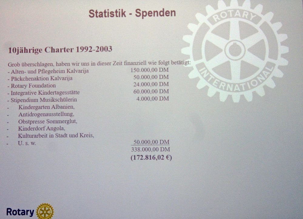 In der Charter 1992 bis 2003 waren 338.000 DM (rund 172.000 Euro) an verschiedene Projekte ausgereicht werden. Und auch die Charter 2004 bis 2016 mit 127.000 Euro war nicht weniger erfolgreich.