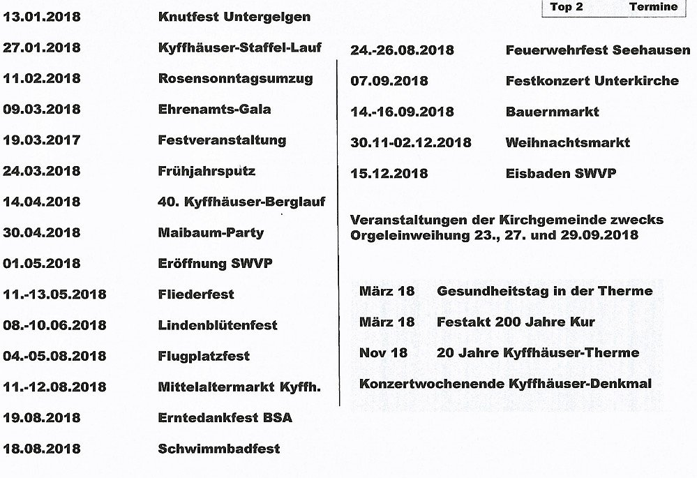 Zwei besondere zusätzliche Veranstaltungen wird es geben, so eine Gesundheitswoche im März und ein großes Event (Juni noch unklar) am Kyffhäuserdenkmal. Geordert werden soll ein bekannter Künstler, der aber noch nicht genau feststeht.