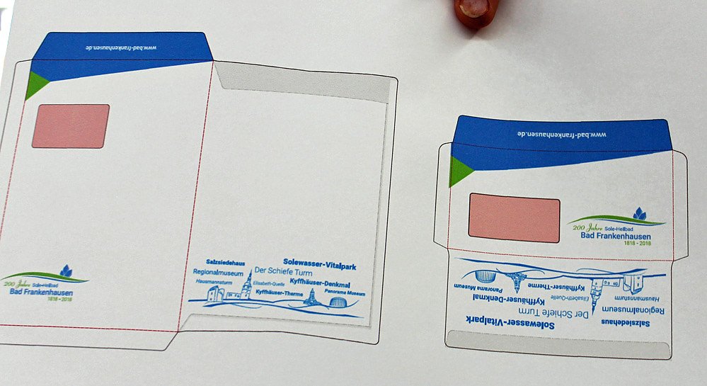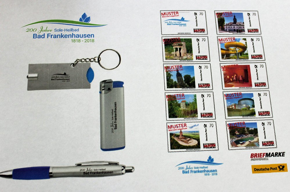 Gestern präsentierte man das offizielle Logo für Bad Frankenhausen und nicht nur das. Es wird ein ganzes Set an Werbemitteln geben, damit die Kurstadt in den Mittelpunkt gerät. So wird es abgefülltes Badsalz aus der eigenen Produktion geben, dass Siedehaus feiert "so nebenbei" sein 20 jähriges Bestehen. Für Briefmarkenfreunde wird es gleich mehrere Leckerbissen geben. Briefumschläge mit dem Logo, ein 10er Briefmarkenset 0,70 Euro mit Motiven von Bad Frankenhausen (echt zum Versenden) und als Clou am 15. September wird ein Sonderpostamt Briefe mit einem Sonderstempel abstempeln. Und der Stempel wird am nächsten Tag vernichtet, um die Originalität zu wahren. Einige der Dinge finden Sie in der Bildergalerie.