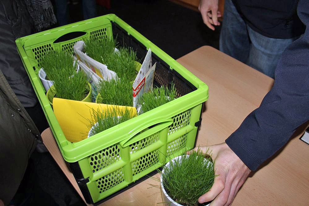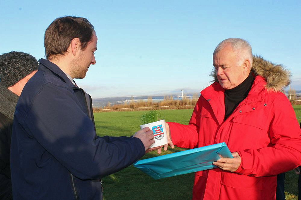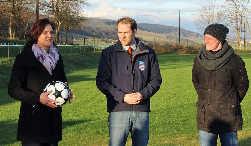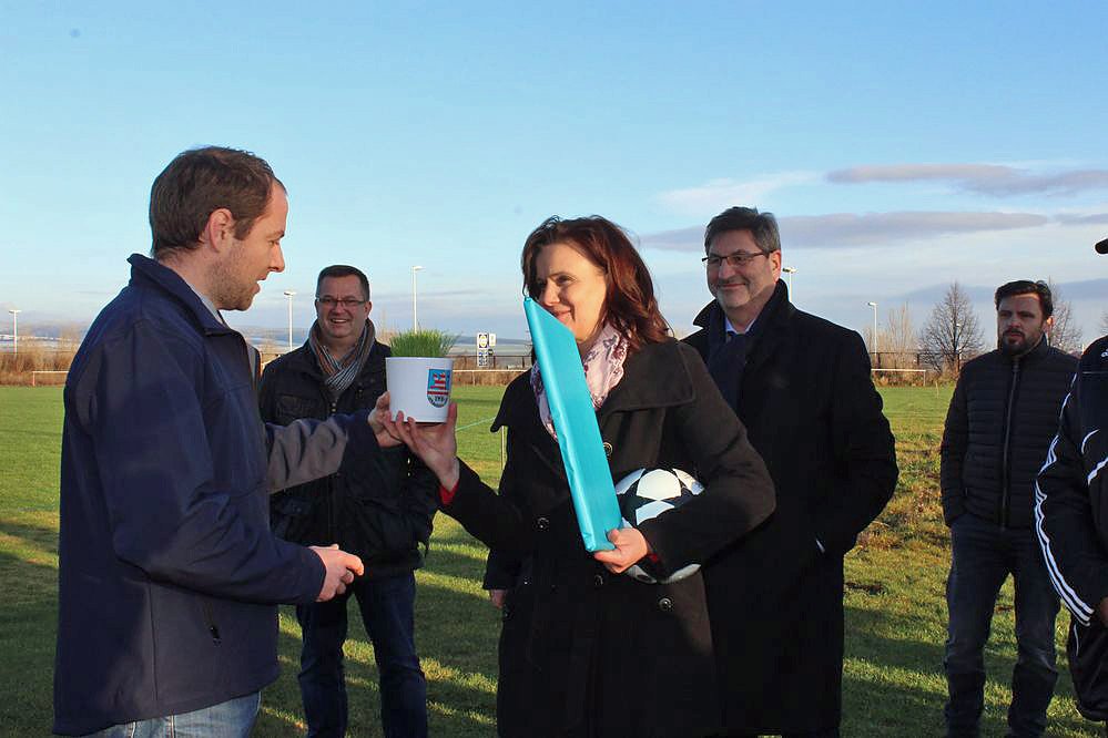 Landrätin Hochwind war nicht mit leeren Händen gekommen, sondern hatte noch einen neuen Fußball für den Veein dabei, den hier Thomas Röber und sein Stellvertreter Stefan Krumbholz erhielten. Im Gegenzug erhielten Ehrengäste ein Topf mit echtem Rasen vom Sportplatz.