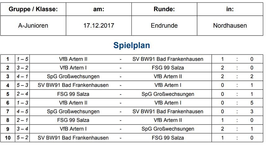 In einer auf 5 Mannschaften reduzierten Endrunde (Berka ist leider nicht angetreten) konnte sich das Team vom VfB Artern mit 4 Siegen und 10:1 Toren souverän vor den Mannschaften aus Bad Frankenhausen und Großwechsungen durchsetzen.
