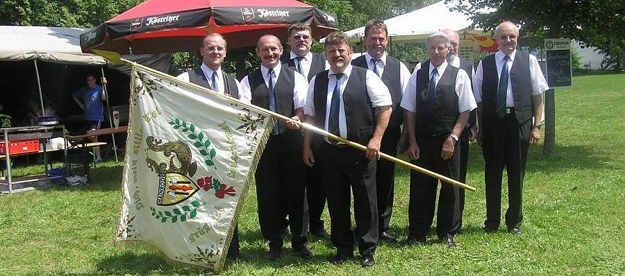 Schmucke, tadellos sitzende Anzüge. Die Sangesbrüder vom Männergesangsverein 1889 Germania Hainrode, auf dem Bild mit Vereinsfahne, machen was her. Rechts: Karl Hofhans, 2. von links: Otfried Pabst.