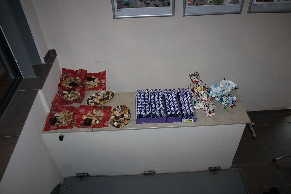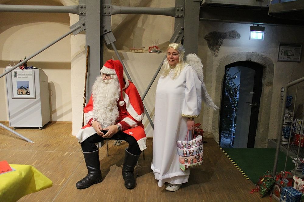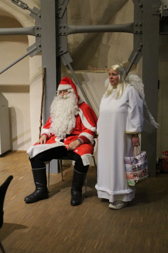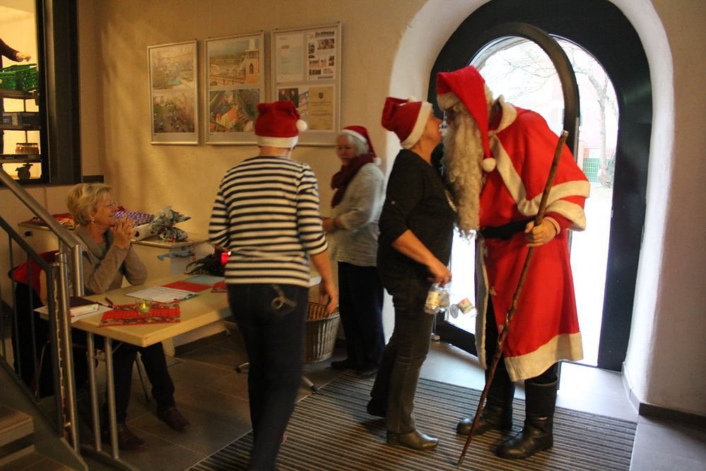 Er war aber nicht so geschafft, dass er nicht die Geschenke an alle verteilen konnte. Damit es nicht zu ungeduldigen Wartezeiten bei 99 zu verteilenden Geschenken kam, hatte man nach einer Tafel mit Kaffee und Kuchen, die Gruppe geteilt. Während in der einen Gruppe ein Weihnachtsspiel lief, teilte in der anderen Gruppe der Weihnachtsmann die liebevoll von Bürgern eingepackten Geschenke aus.