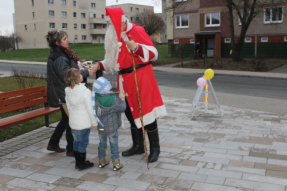Der Weihnachtsengel, im bürgerlichen Leben Sandra Blunk vom Verein Düne e.V., hatte den Weihnachtsmann vorzeitig nach Sondershausen gerufen, um die Geschenke zu verteilen. Wegen Mangel an Schnee musste der Gute gar zu Fuß kommen, wie die Bilder von der Ankunft zeigen.