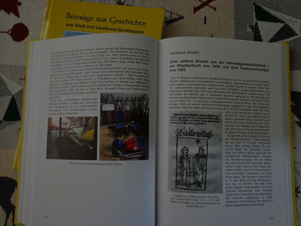 Über die Entwicklung vergangener wintersportlicher Aktivitäten im benachbarten Bad Sachsa weiß Ralph Boehm zu berichten. Seltene Drucke aus der Himmelgarten-Bibliothek haben es Heidelore Kneffel angetan und stellt den Lesern ein Sibyllenbuch von 1493 und eine Poetenanthologie von 1502 vor. An die Herren von Bartolfelde, einem Ministerialen-geschlecht der Grafen von Scharzfeld-Lauterberg, erinnert Hans-Joachim Winzer aus Rastede, und Benjamin Rudolph aus Naumburg hat Wissenswertes über die Stadtbefestigung von Nordhausen zu Papier gebracht.