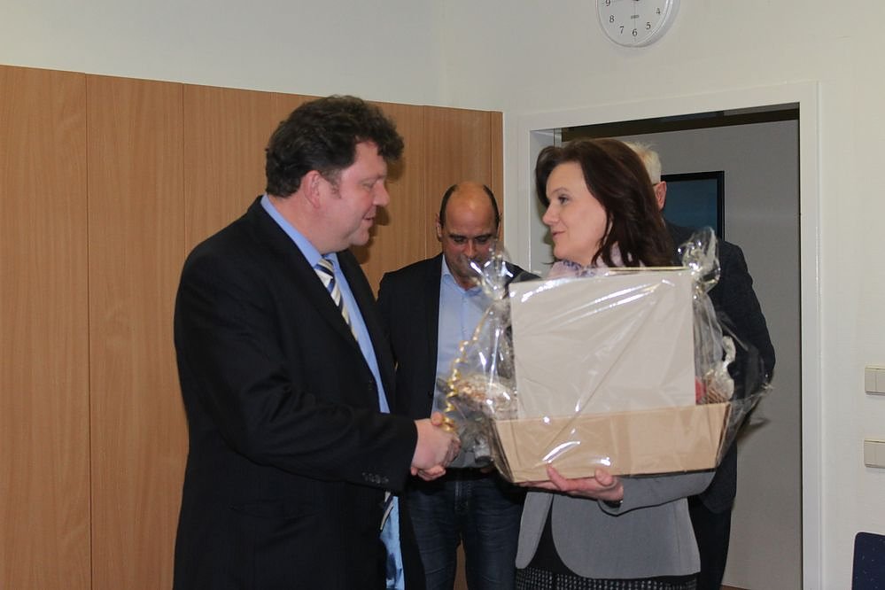 Bevor es zu den vier besuchten Stationen ging, überall gab es einen Präsentkorb, gab es noch Gespräche, an denen neben dem Geschäftsführer der DRK Krankenhausgesellschaft Thüringen Brandenburg mbH Dr. Uwe Bust u,a, auch Dr. Mathias Schäfer Chefarzt in Sondershausen, Dr. med. Bernd-Michael Grauel teilnahmen.