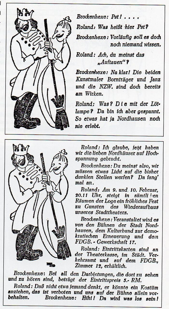 Zeugnis von diesem Vorhaben legten im Januar 1948 symbolisch auch der Roland und die Hexe ab, die als gezeichnetes Paar nebst Sprechtext in der Tageszeitung Thüringer Volk auftraten und warben. Ilsetraut Glock schuf Bühnenbilder für Jean-Paul Sartres existenzialistische Stücke Die Fliegen oder Geschlossene Gesellschaft. Intendant Fisch bestätigte ihr im Sommer 1946, dass Frau Ilsetraut Glock als Bühnenbildnerin arbeitet und in letzter Zeit u. a. die Entwürfe zu Hebbels Maria Magdalena, Schnitzlers Anatol, Shakespeares Wie es euch gefällt, Wildes Ein idealer Gatte und Der Froschkönig ausgeführt und die Herstellung ihrer Bühnenbilder überwacht und geleitet habe.