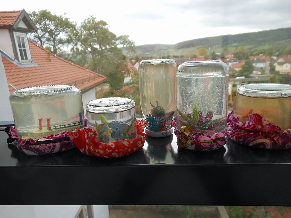 Wer Lust hat, kann ein kleines Schraubglas und seine Lieblingsfigur, die wasserfest sein muß, mitbringen. Diese wird dann im Gläschen festgeklebt und konserviert. Schon hat jeder seine Unikat-Schneekugel!