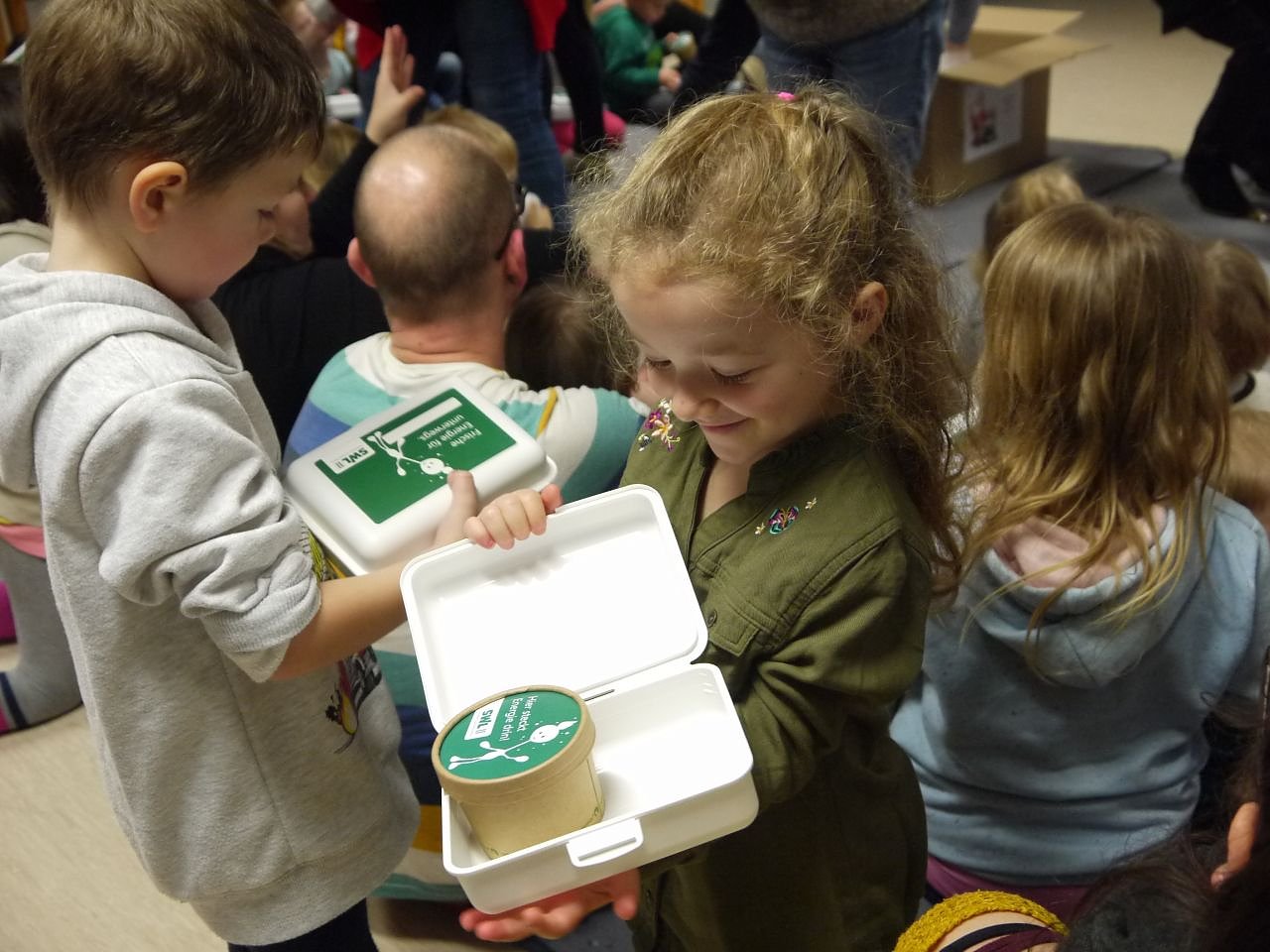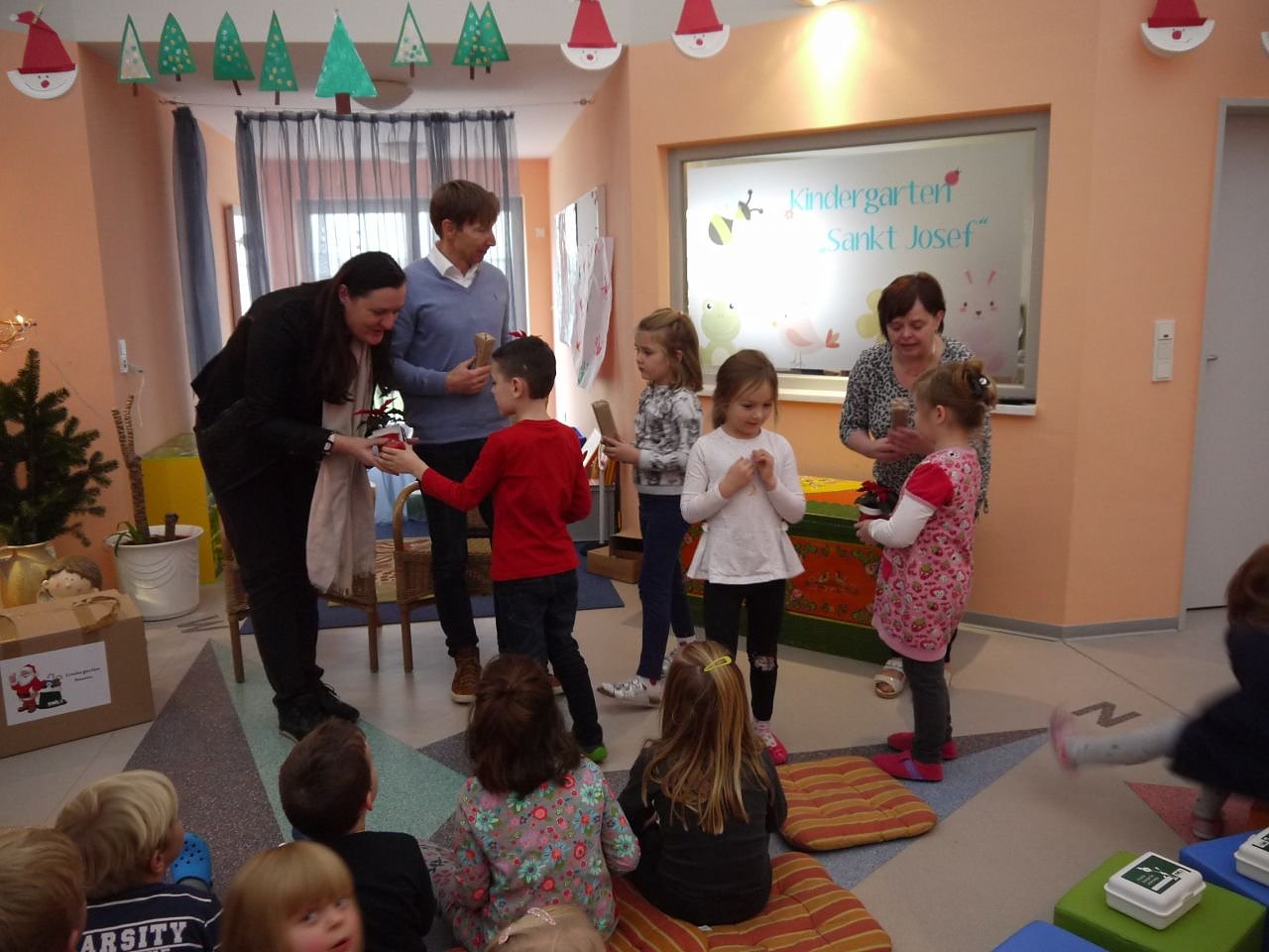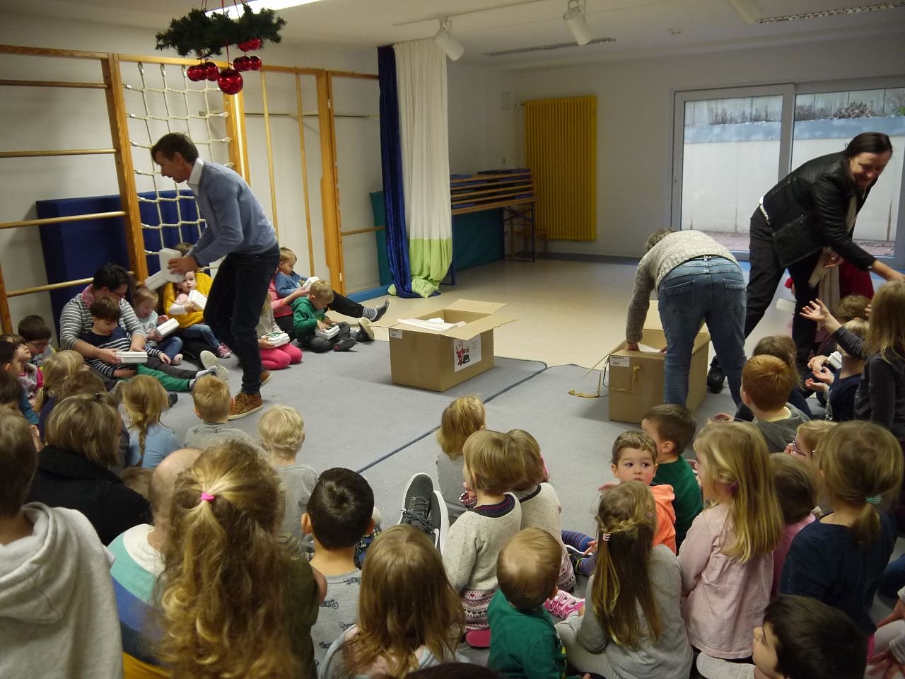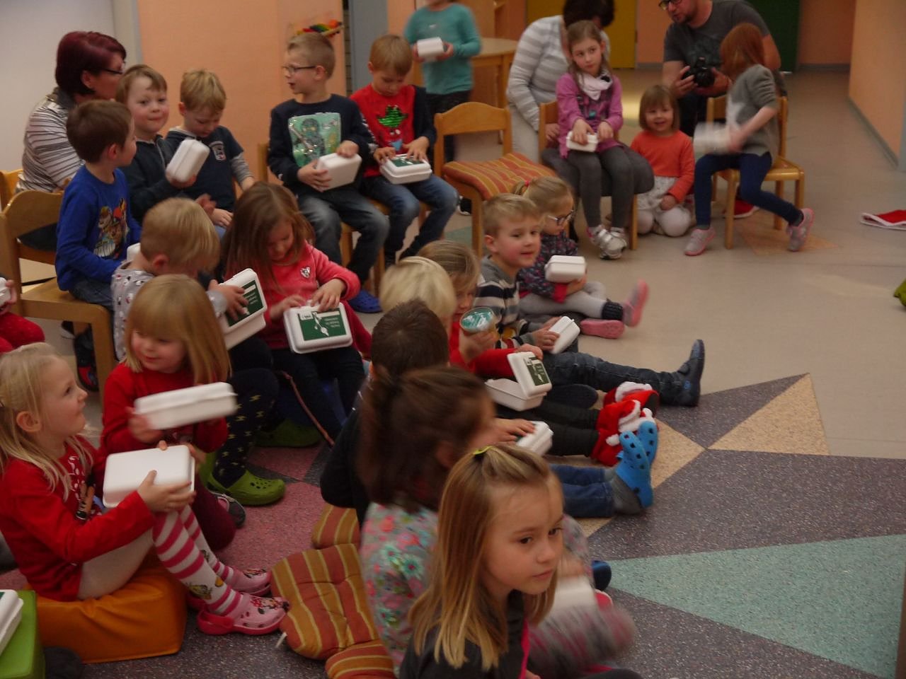 Freuen konnten sich die Kinder über eine Brotdose für den Kindergarten mit einem Becher gesundes Müsli drin. Jedes Jahr kommen von der SWL neue Geschenke für die Kinder. Und viele Mädchen und Jungen von den älteren Gruppen konnten sich auch an vergangene Geschenke erinnern.