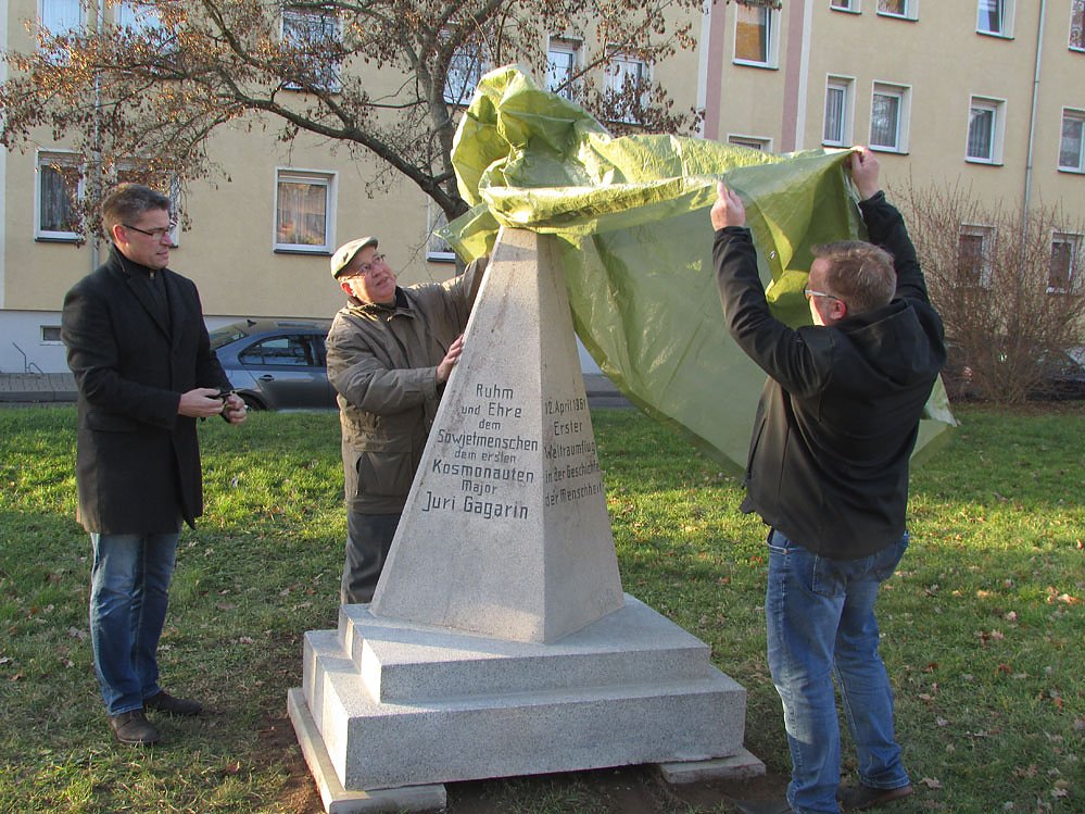 Achtundfünfzig Jahre später fand die offizielle Übergabe erwartungsgemäß in kleinerem Rahmen statt: mit Bürgermeister Torsten Blümel, einigen Stadträten sowie Mitgliedern des Heimat- und Geschichtsvereins Goldene Aue und des Heimatvereins ARATORA. Nach der Enthüllung des Steins wurde dieser von den Anwesenden als gelungen bezeichnet. Ebenso scheint der jetzige Standort optisch die bedeutend bessere Variante zu sein. Nun ist das Gagarin-Denkmal viel besser und schon von weitem erkennbar!