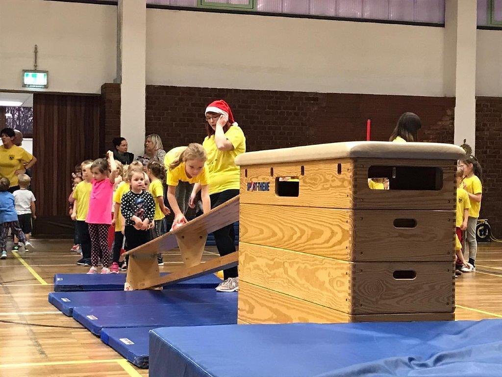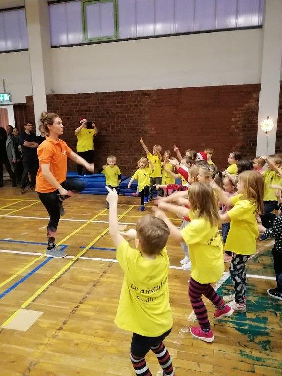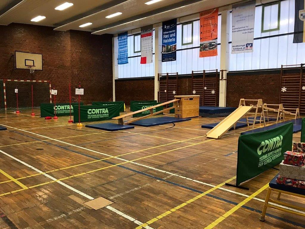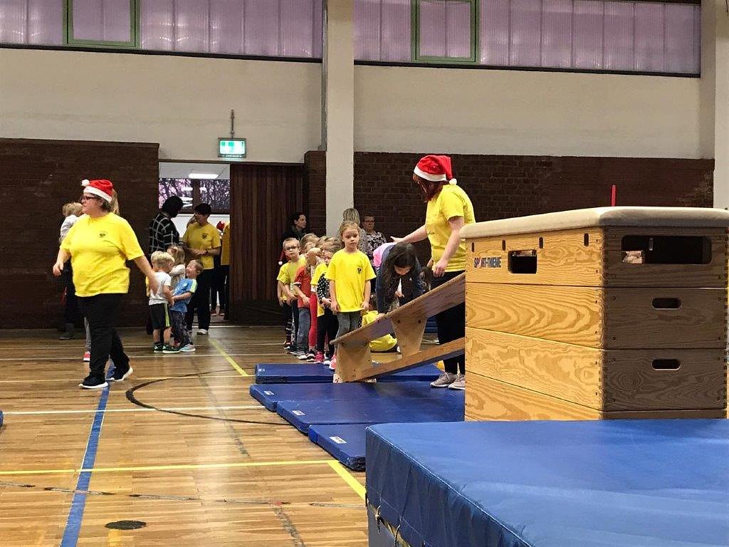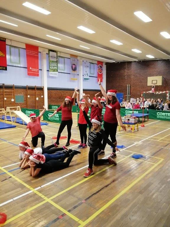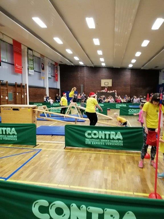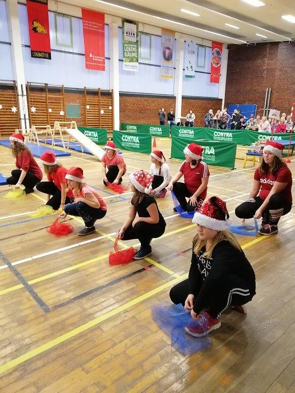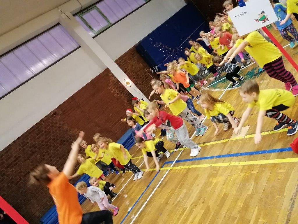 Nach einer flotten Erwärmungsrunde ging es für die Sportlerinnen und Sportler an vier Olympia-Stationen, wie Eislaufen, Curling, Skispringen und dem Geschenke-Hindernis-Parkour. Hier mußte