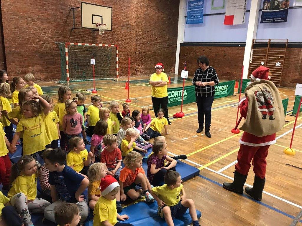 Trotz großer Baustelle vor der Sporthalle fand er den Weg zu den Kindern und er kam nicht mit leeren Händen. Einen großen Sack voll Geschenke und für jeden einen süßen Beutel hatte er mitgebracht.