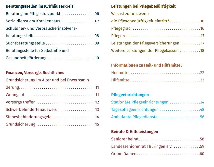 In der Broschüre sind wieder die zahlreichen Beratungsstellen im Kyffhäuserkreis (Pflegestützpunkte, Sozialdienst, Schuldnerberatung und mehr) aufgeführt. Es git Tipps für Finanzen, Vorsorge und Rechtliches) und wie Leistungen bei Pflegebedürftigkeit bezogen werden können. Es gibt viele Informationen zu Bewegung und Mobilität und mehr in der 83 Seiten umfassenden Broschüre.