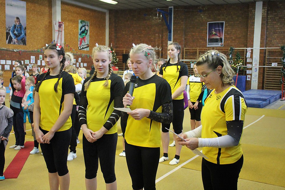 Und das man nicht nur sehr gut turnen kann, zeigten diese drei Mädchen, denn sie eröffneten mit einem Gedicht die Weihnachtsturngala. Sektionsvorsitzende Sabine Angelstein über nahm den Part der Begrüßung der Gäste, unter ihnen Landtagsmitglied Stefan Schard (CDU).