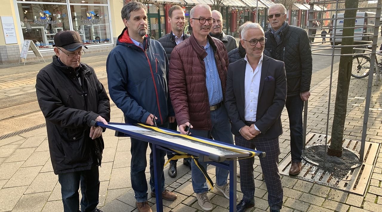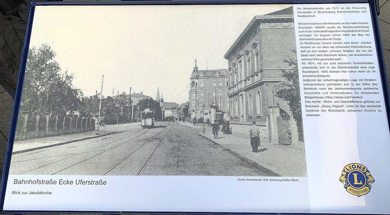 Oberbürgermeister und Pressesprecher der Stadt ließen es sich nicht nehmen, höchstselbst zur Südharz Galerie zu eilen, wo die erste der insgesamt 15 geplanten Tafeln mit Stadtansichten vergangener Tage (vor der Bombardierung Nordhausens) im Beisein von mehreren Lions-Vertretern feierlich eingeweiht wurde.