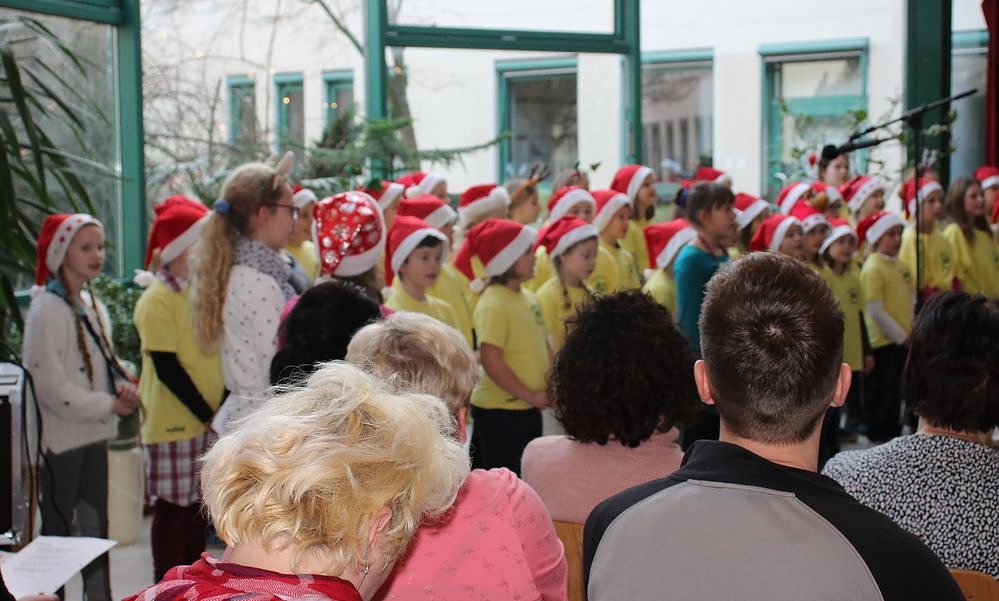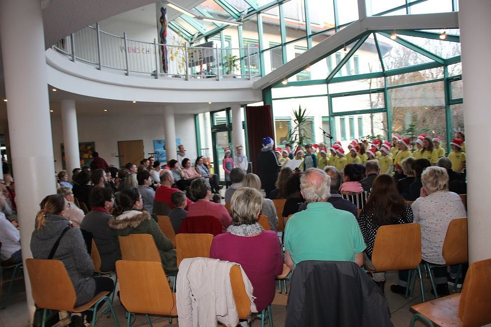 Heute gab es am Nachmittag den Auftritt vor Eltern, Großeltern, Freunden und Bekannten. Am Vormittag gab es das Weihnachtskonzert vor den Schülerinnen und Schülern der Franzbergschule, bei dem auch Schülerinnen und Schüler des Förderzentrums dabei waren. Die insgesamt rund 60 Chormitglieder sind aus den 2. bis 4. Klassen.