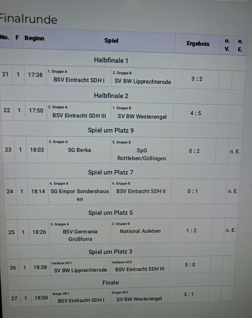Im ersten Halbfinale schlug der BSV Eintracht I die SV Blau Weiß Lipprechterode mit 3:2 und im zweiten Halbfinale verlor BSV Eintracht Sondershausen gegen III Blau-Weiß Westerengel mit 4:5.