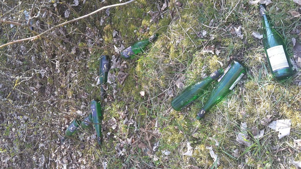 Auf einer Fläche von ca. 20 Quadratmetern lagen mindestens 60 Wein- und Schnapsflaschen; viele sahen noch ganz frisch aus.