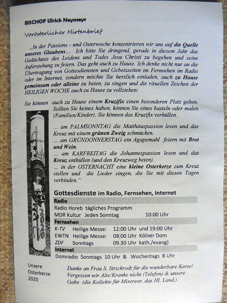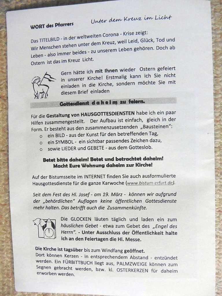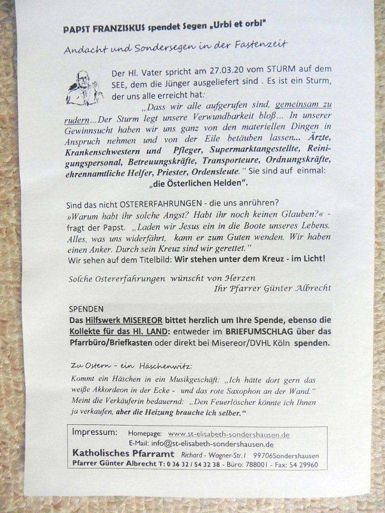 Aus der katholischen Kirchgemeinde Neue Wege beim Gottesdienst Eine Nachricht von Pfarrer Albrecht von der Katholischen Gemeinde "St. Elisabeth" Sondershausen verweist auf den aktuellen Pfarrbrief... Neue Wege beim Gottesdienst (Foto: Jürgen Kieper) Fotos: Jürgen Kieper