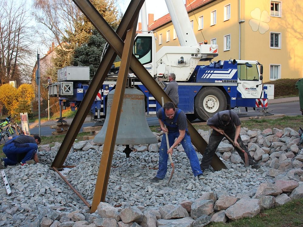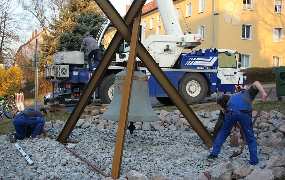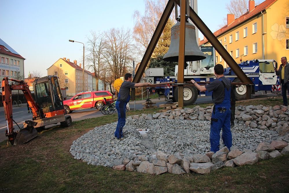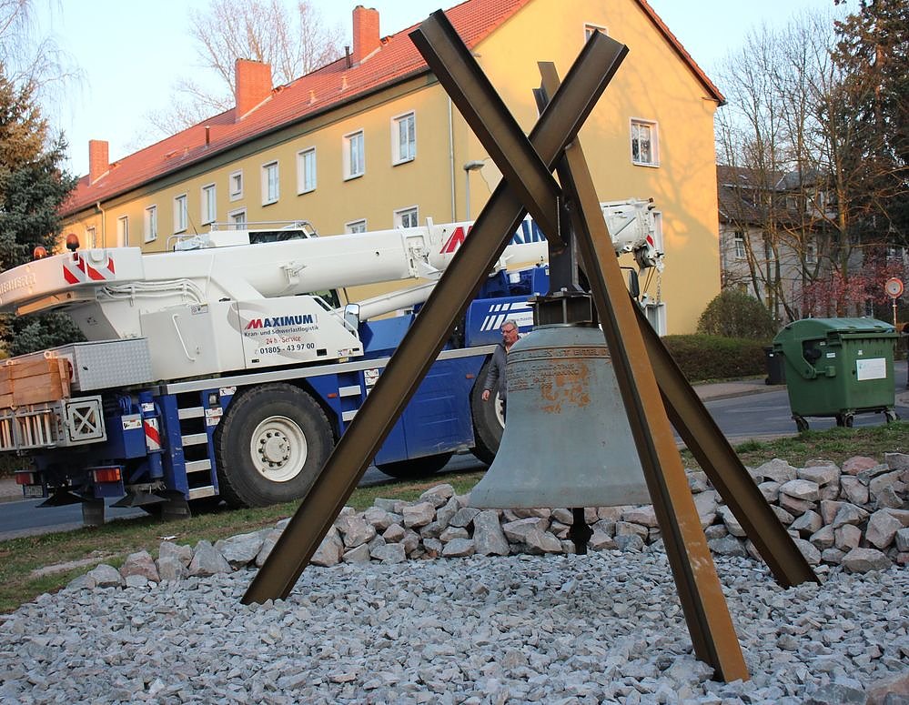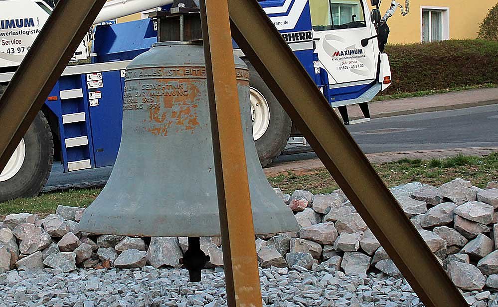 Nach Aufarbeitung in der Sondershäuser Metallbaufirma Lien GmbH wurde die Glocke heute mit Sicherung durch die Polizei und den Kameraden der Freiwilligen Feuerwehr Stockhausen an ihren endgültigen Standort gebracht. Hier soll die Glocke in der Güntherstraße als Mahn- und Gedenkort für die Bombardierung der Stadt Sondershausen dienen.