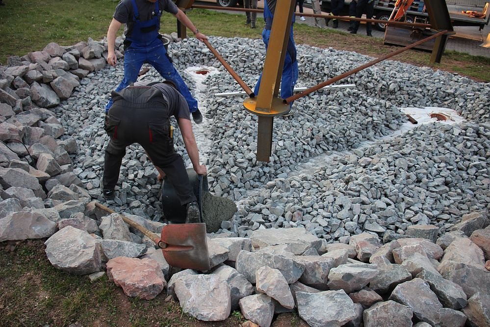 Als Einweihungstermin sollte der 8. April 2020 sein, anlässlich des 75. Jahrestages der Bombardierung der Stadt Sondershausen, wie Bürgermeister Steffen Grimm (pl) informierte, der hier das Aufstellen beobachtete.
