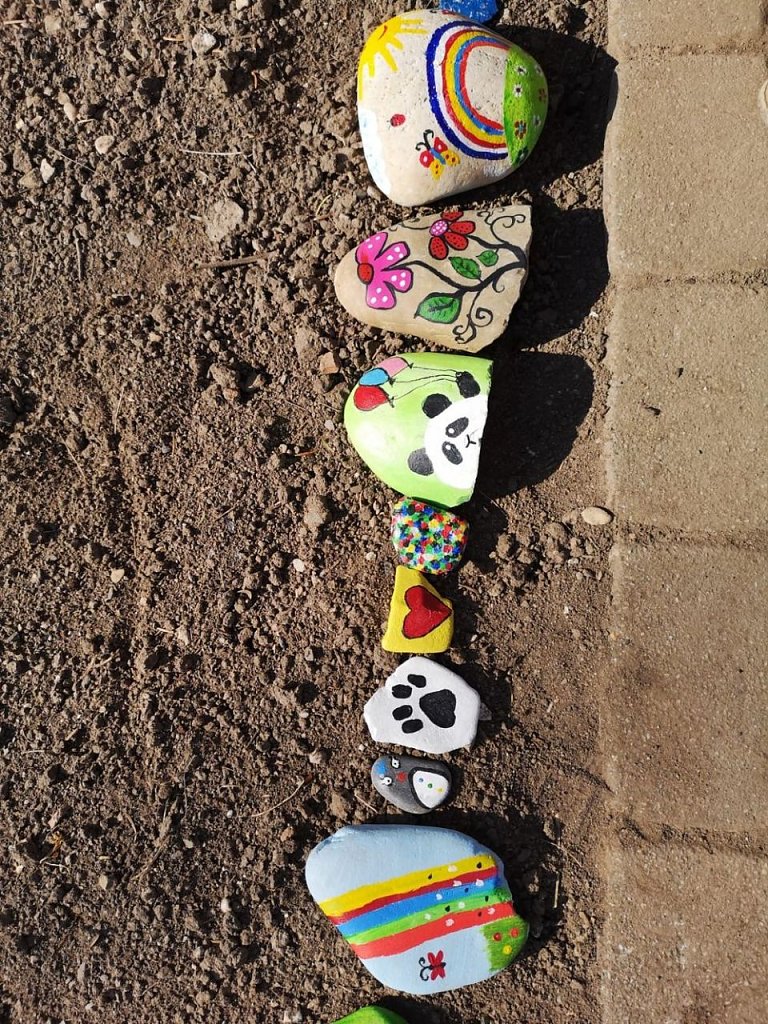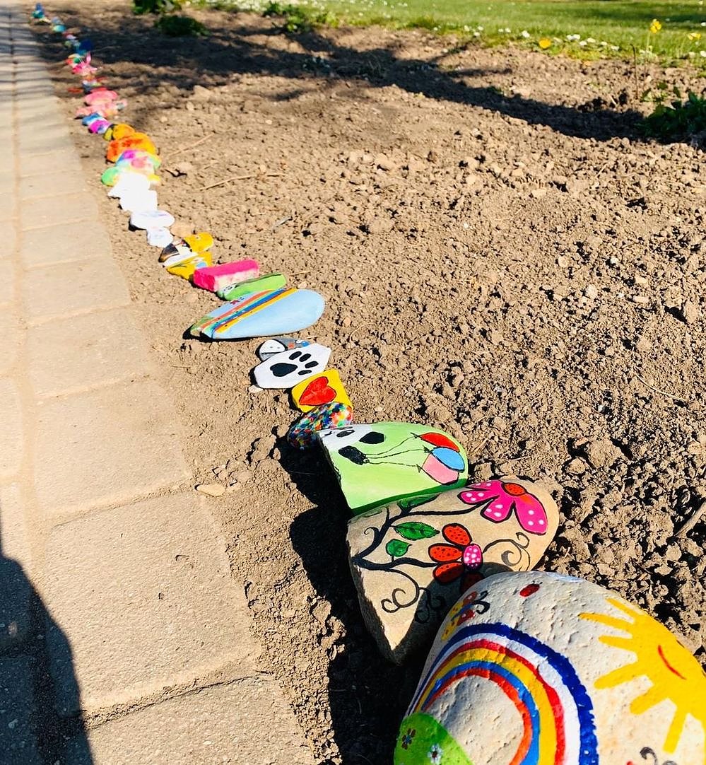 "Liebe Kinder, liebe Spaziergänger, Malt auch ihr Zuhause einen Stein an und legt ihn dazu. Mal schauen wie lang die Schlage wird! Es soll Abwechslung und Hoffnung übermitteln" so der Aufruf von Eileen S., Eileen H und Edith im Internet.
