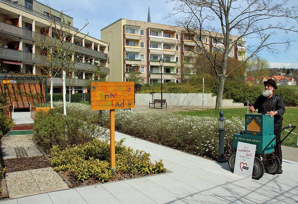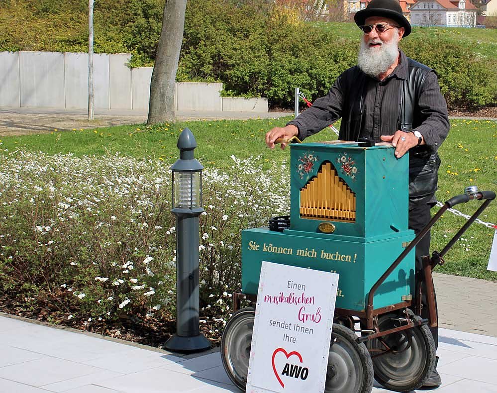 Am Karfreitag spielte der beliebte Erfurter Drehorgelspieler Mr. Evergreen für die ersten AWO-Pflegeheime im Kyffhäuserkreis auf. Es war der Start der ersten drei von acht Konzerten im Kyffhäuserkreis. Insgesamt sind es 37 Konzerten, die der Musiker in den kommenden zwei Wochen für Pflegeeinrichtungen der AWO AJS gGmbH in Thüringen geben wird.
