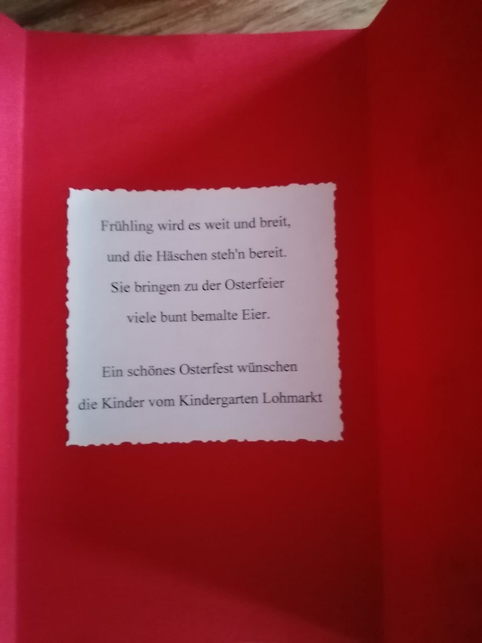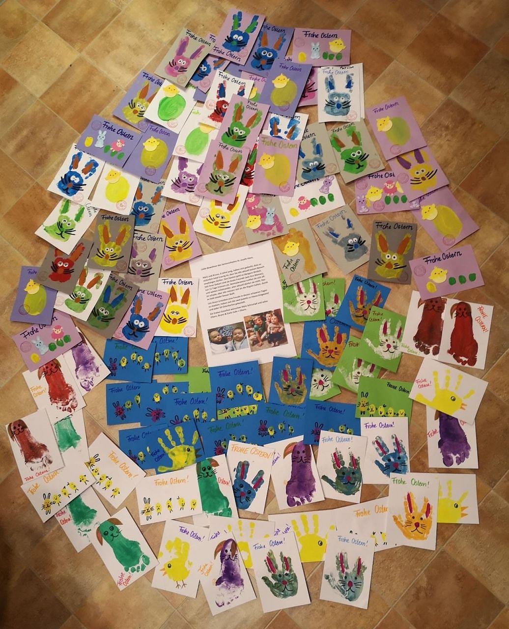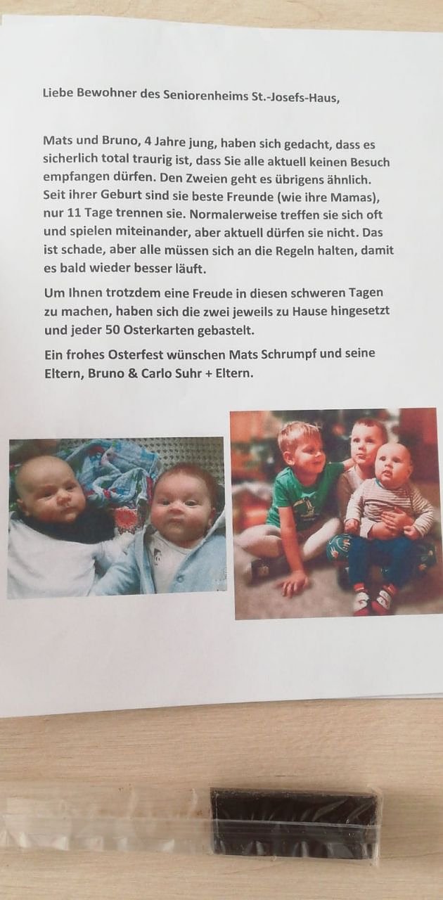 Unser besonderer Dank geht an den Lohkindergarten, für die Osterkarten, die für jeden unserer Bewohner gebastelt wurden, an die Blasiikirche, aus der ebenfalls viele selbstgebastelte Ostergrüße gesendet wurden. Weiter an Mats Schrumpf, Bruno und Carlo Suhr und deren Eltern, die uns 98 selbstgebastelte Osterkarten persönlich übergeben haben.