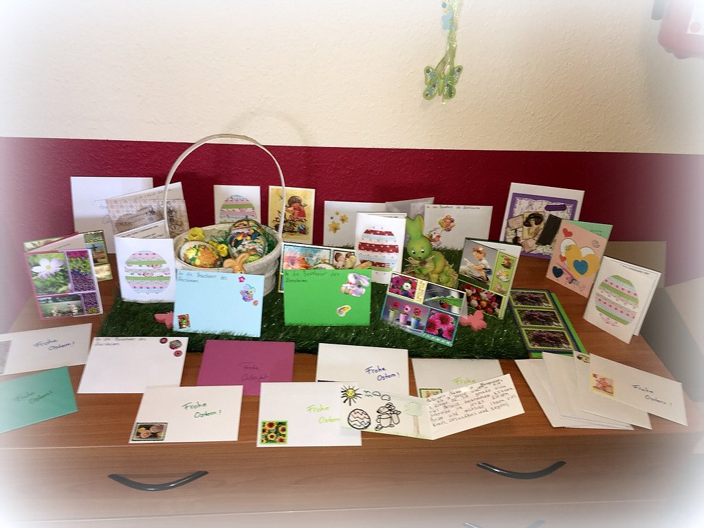 Ein großes Dankeschön an Frau Alpers von Biela, die uns in dieser Zeit begleitet und unterstützt. Unaufgefordert überbrachte sie uns Andachten und Grußkarten für jeden Einzelnen, geschrieben und gebastelt von Mitgliedern der Evangelischen Kirchengemeinde Sankt Blasii, Altendorf Nordhausen. Die Bewohner waren sichtlich gerührt.