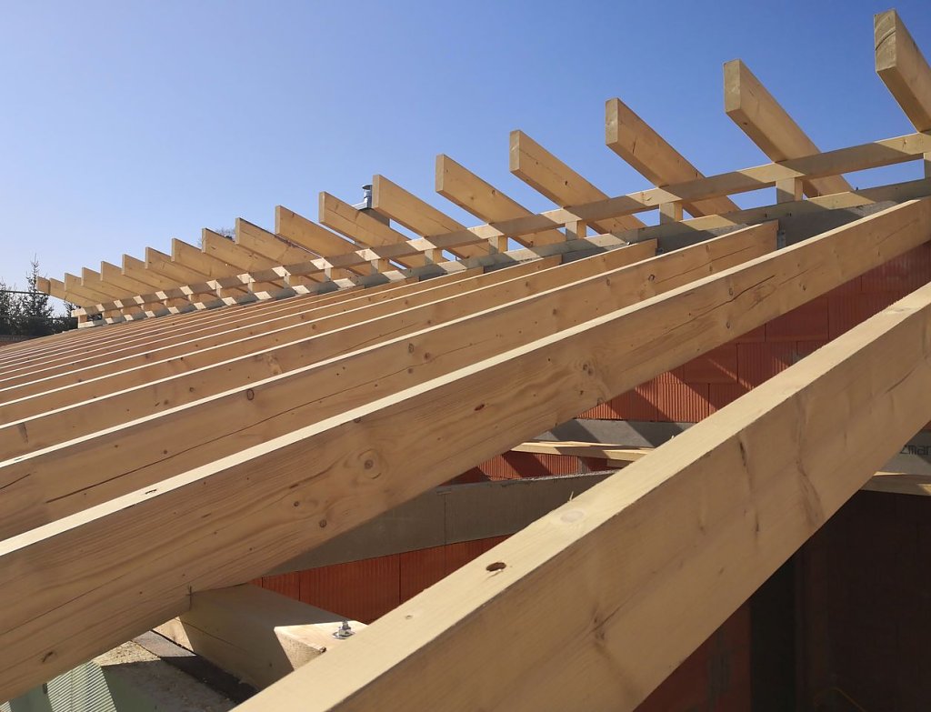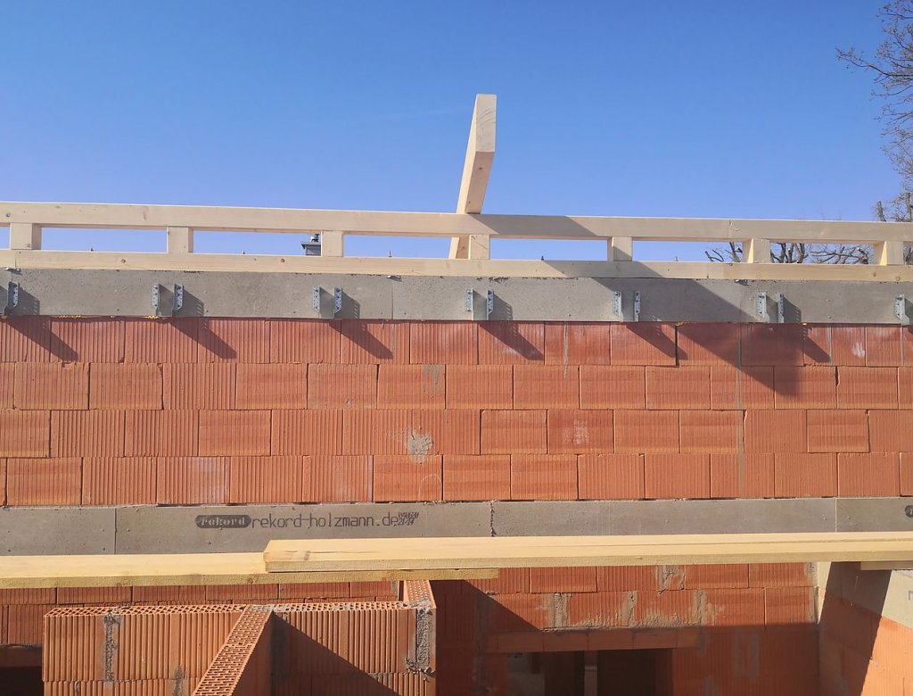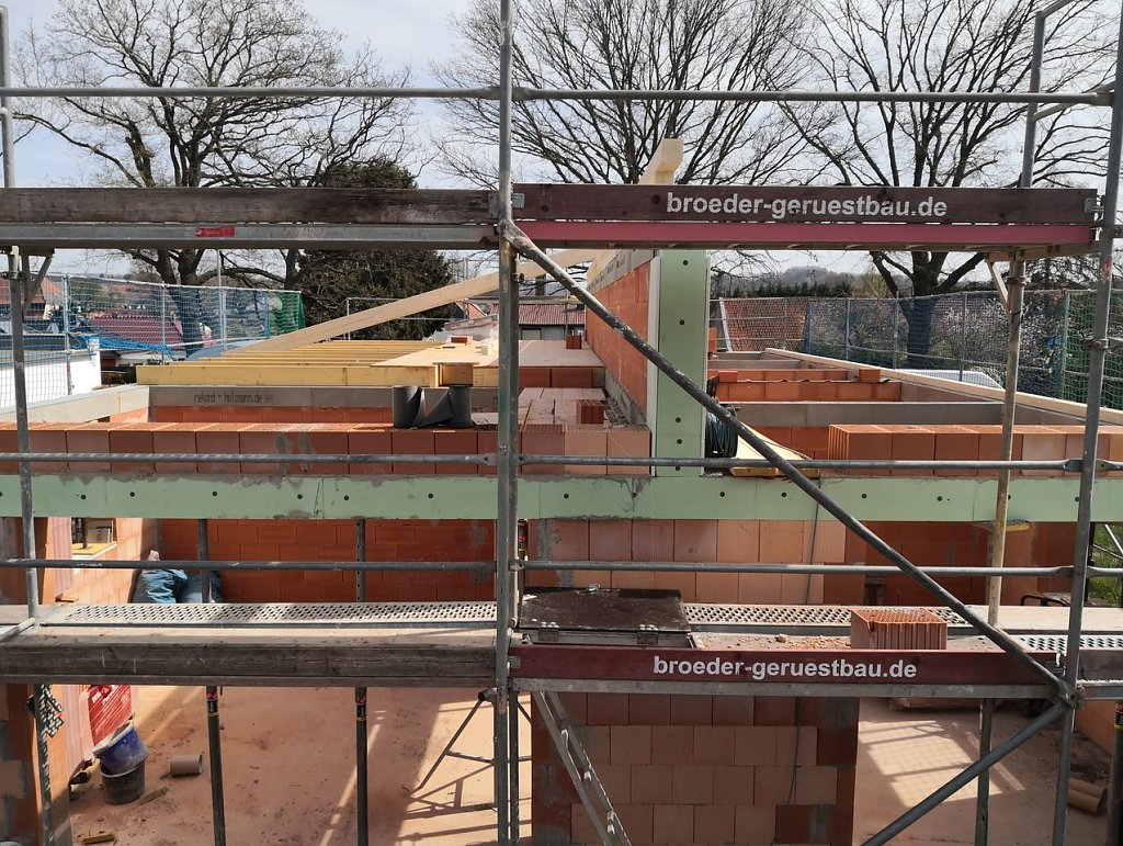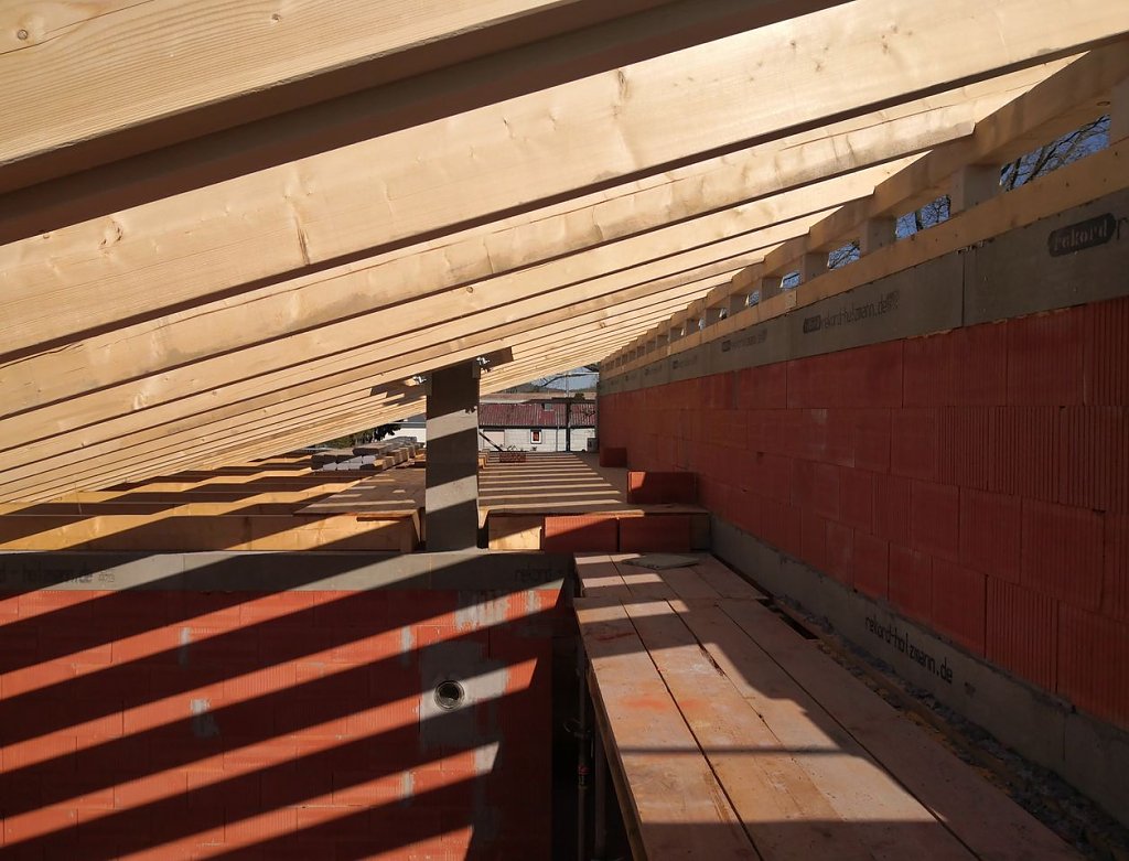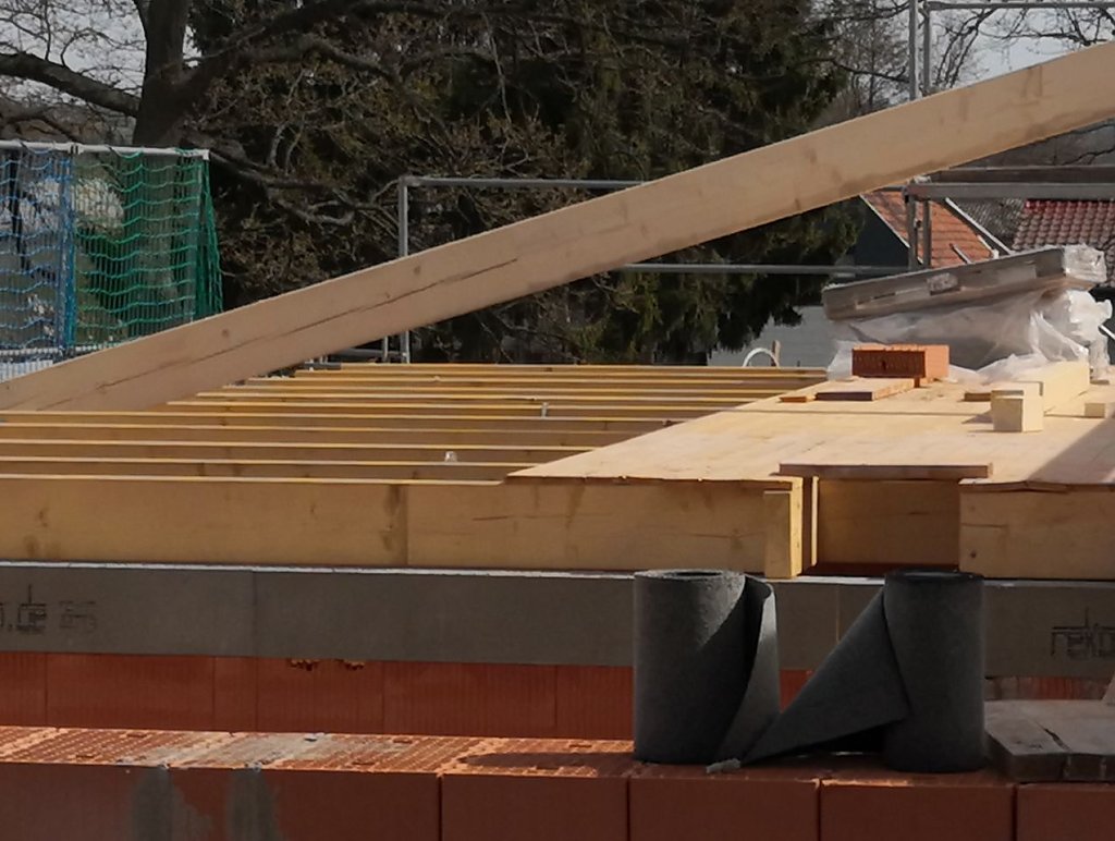 Knapp zwei Wochen war Pause am Rande der Rolandstadt. Dann endlich, am Dienstag, kam das Holz, das dem bisherigen Rohbau vielleicht den ersten Hauch von einem richtigen Haus verleihen kann. Die Zimmermänner waren zu Gange, maßen ab, sägten, nagelten und schraubten.