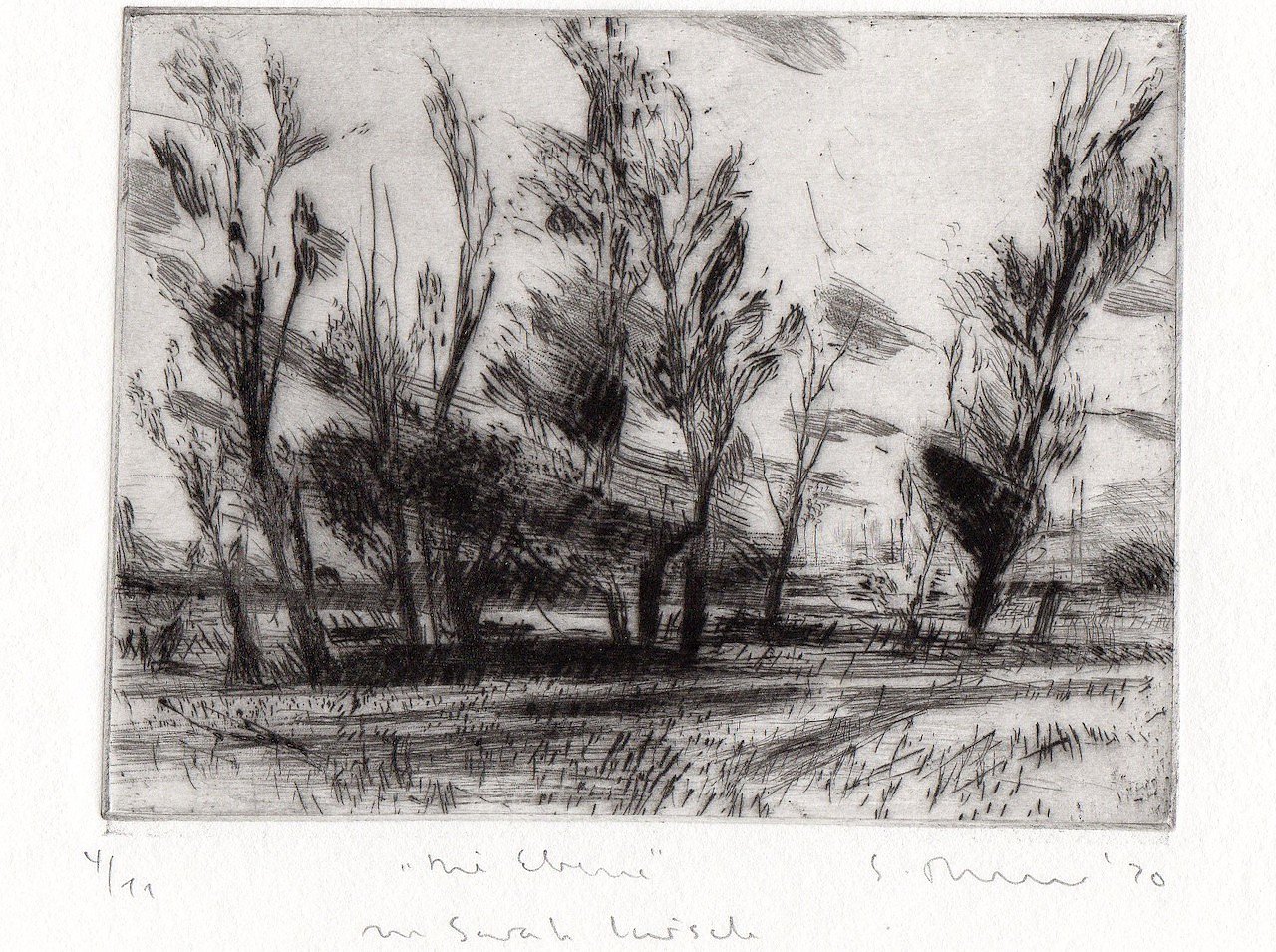 Sowohl bei der Dichterin als auch bei der Künstlerin sind Pappeln besonders geliebte Gewächse. So wundert es nicht, dass in dem Kirsch-Gedenkblatt mehrere dieser bewegten Bäume aus der Ebene in den leicht mit Wolken versehenen Himmel ragen. Der mit der Theumer befreundete Dichter und Schriftsteller André Schinkel, den wir auch schon in Limlingerode zu Gast hatten, beschreibt diese Baumvorliebe der Künstlerin so: "... Und es sind ja letztlich lebende Pyramiden, diese Pappeln, wie sie dem Wind trotzen und ihre Häupter ins Licht hinstrecken, ein Bild vielleicht dessen, wonach alles strebt, nach dem Ursprung, der Herkunft aus den Gestirnen."