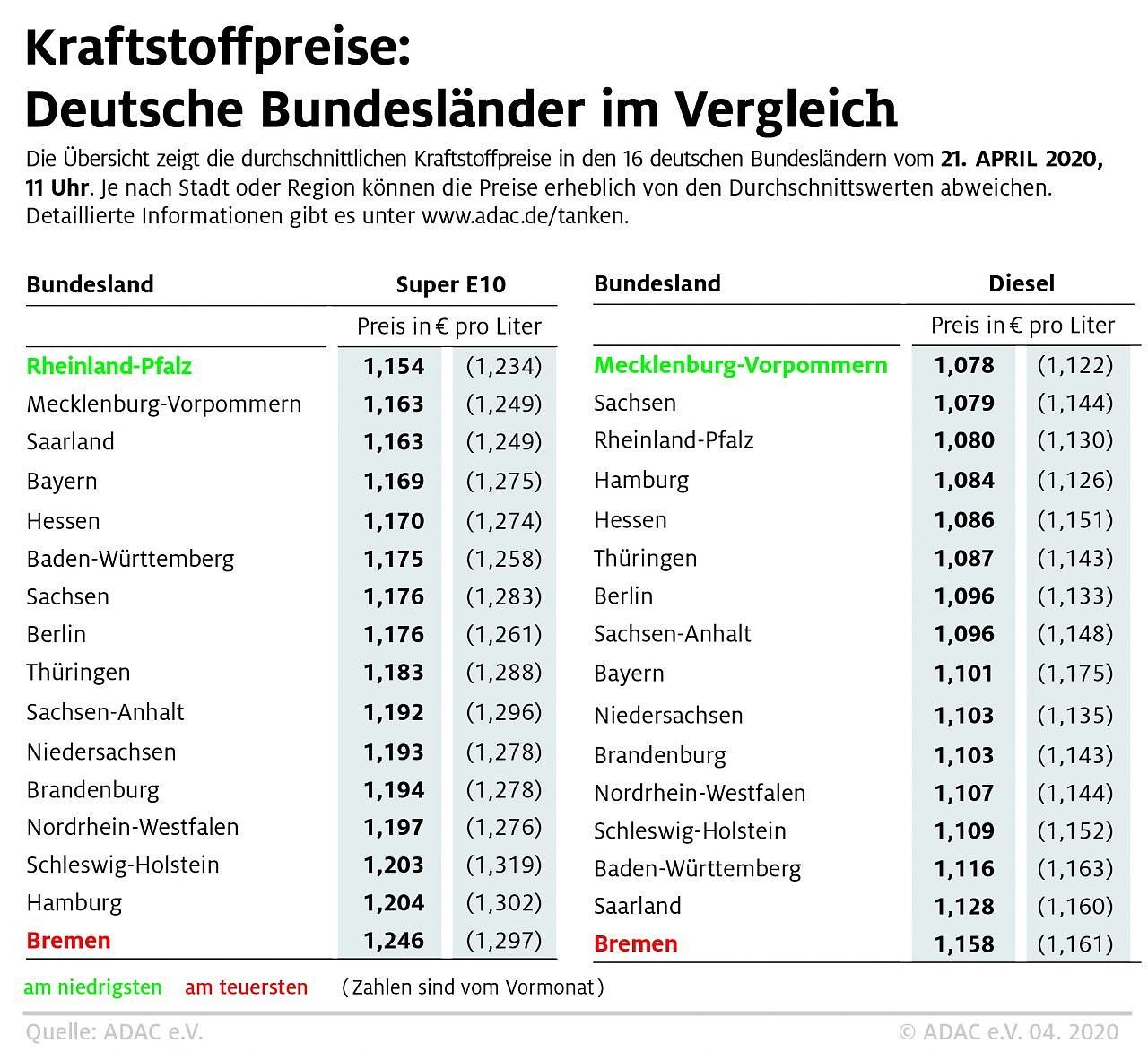 Laut aktuellem Bundesländervergleich kostet ein Liter dort durchschnittlich 1,154 Euro. Auf Platz 2 mit jeweils 1,163 Euro je Liter folgen das Saarland und Mecklenburg-Vorpommern. Schlusslicht ist der Stadtstaat Bremen, wo man für einen Liter Super E10 im Mittel 1,246 Euro und damit 9,2 Cent mehr als in Rheinland-Pfalz bezahlen muss. Bei einer 40-Liter-Tankfüllung ergeben sich dadurch Mehrkosten von immerhin 3,68 Euro.