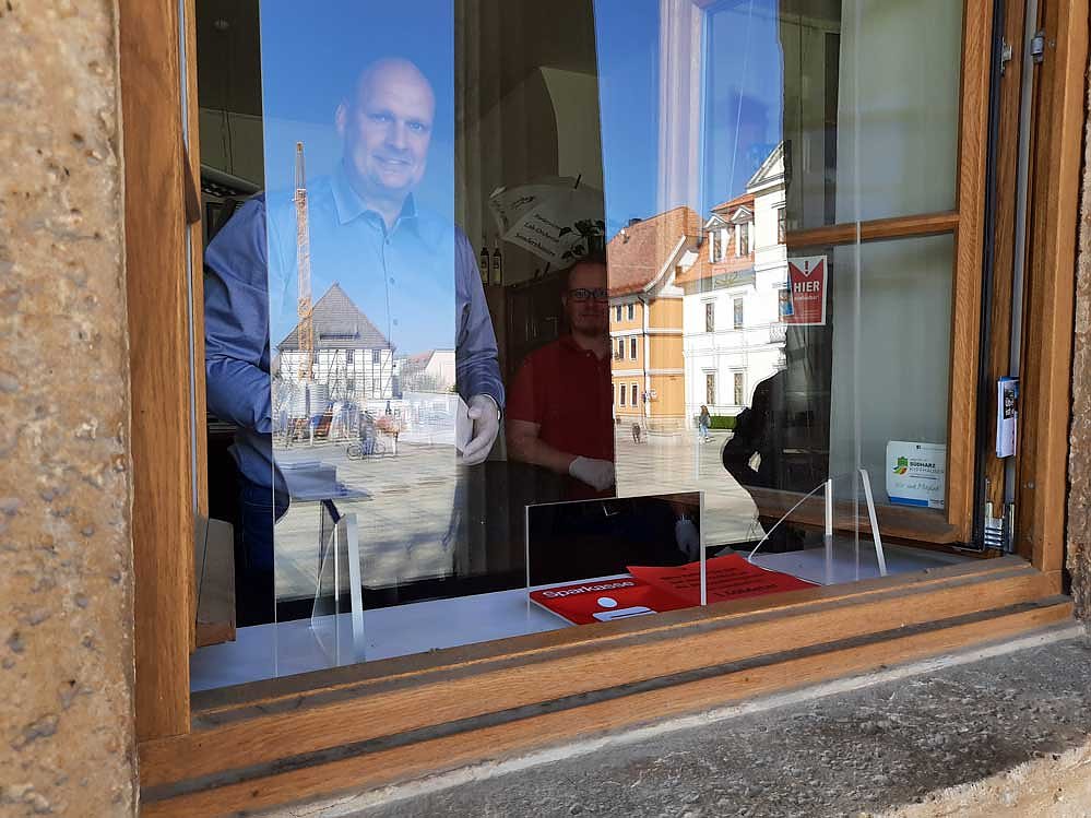 An der Ausgabestelle Touristinformation Sondershausen ließ es sich Sondershausens Bürgermeister Steffen Grimm (pl) nicht nehmen, selbst die Ausgabe zu übernehmen. Die Plexiglasschutzscheibe war allerdings für das Fotografieren nicht von Vorteil. Schon in der ersten Stunde wurde über 300 Masken zum Preis von einem Euro umgesetzt.