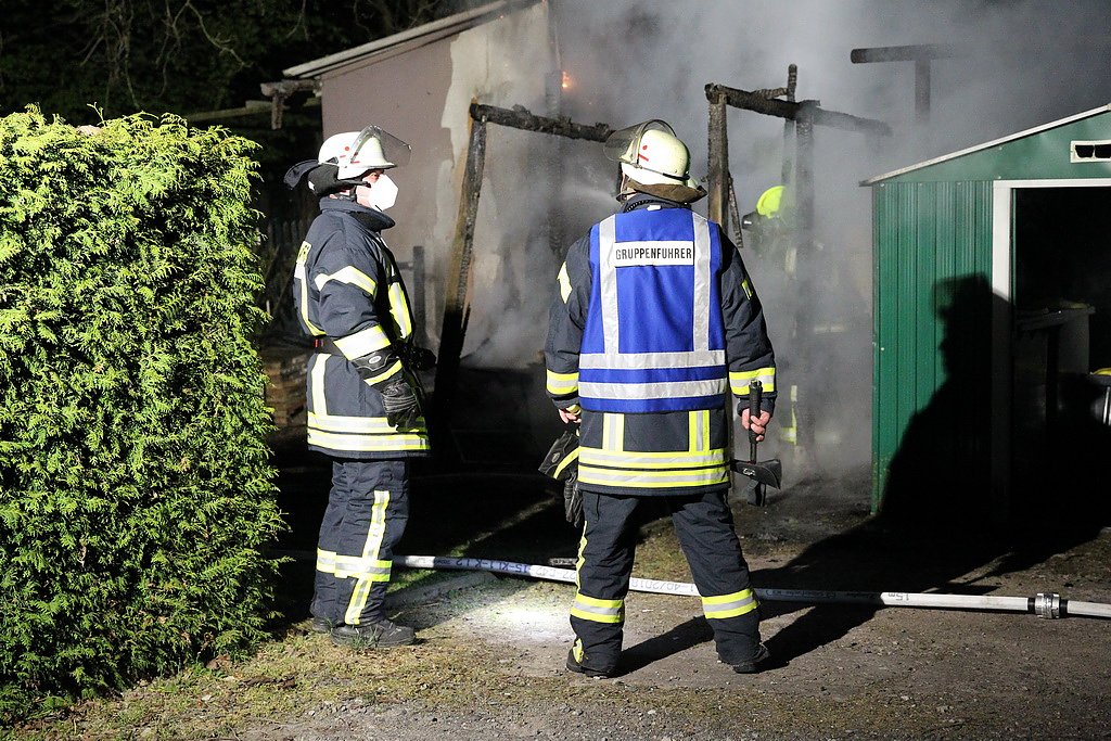 Beim Eintreffen der Feuerwehren stand der Schuppen bereits im Vollbrand. Trotz sofortiger Löschmaßnahmen brannte das Objekt vollständig ab.