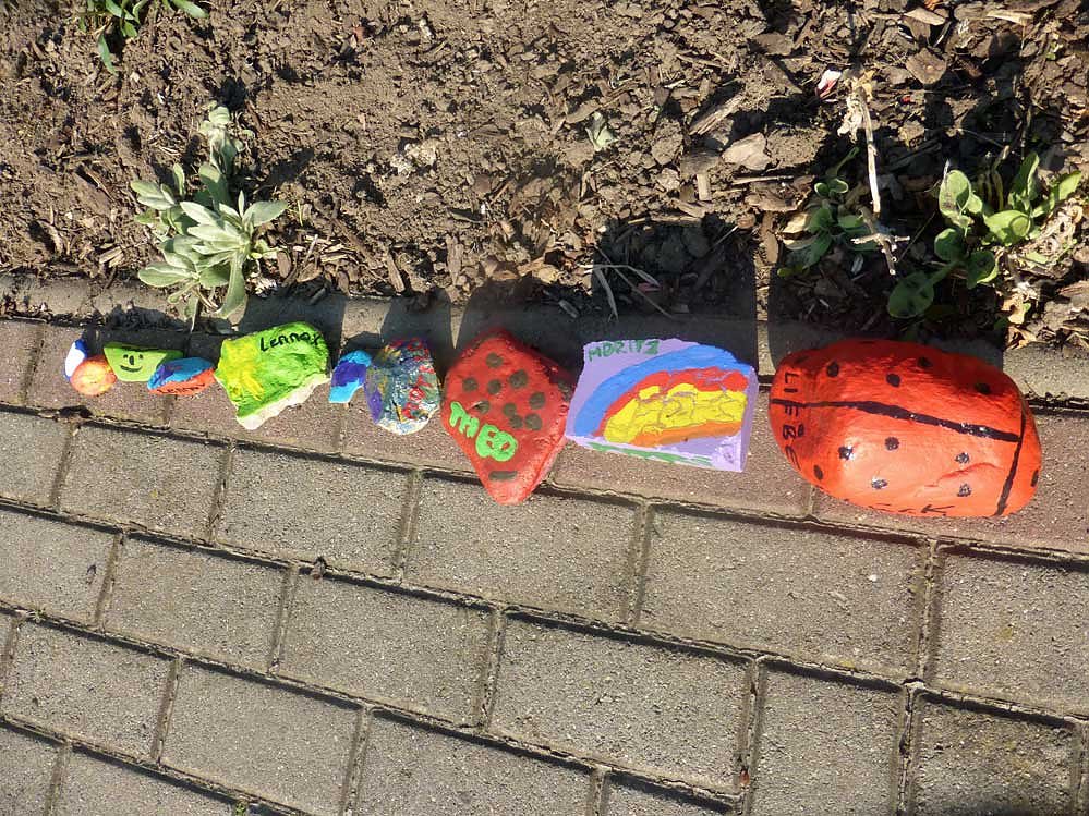 Einige Kinder haben schon Steine bemalt und unsere Glückssteinschlange erweitert. Wir hoffen und wünschen uns, dass wir uns bald frisch und munter wiedersehen.
