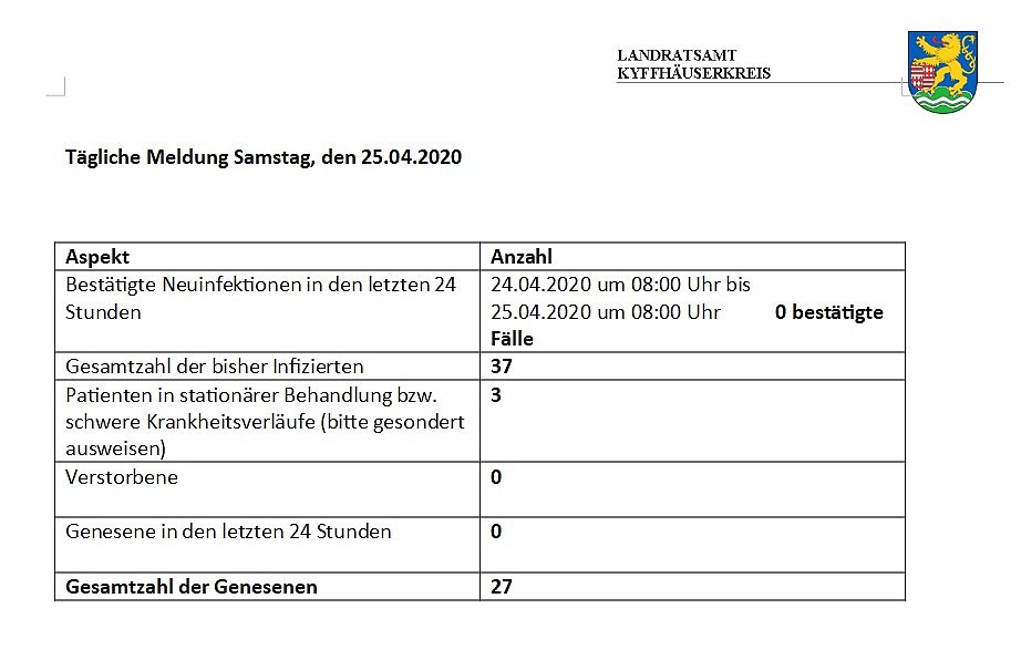 Hier wie gewohnt die tägliche Meldung aus dem Landratsamt Kyffhäuserkreis über den Stand der infizierten Personen im Landkreis...