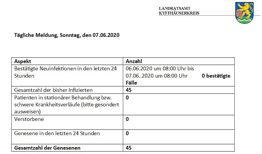 Hier die tägliche Meldung zu Corona aus dem Landratsamt Kyffhäuserkreis....