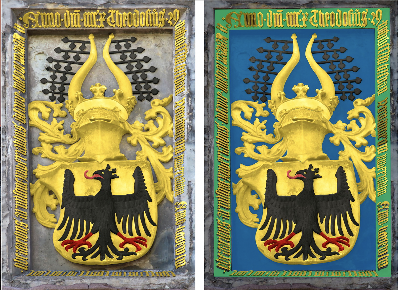So könnte der "Theo" restauriert aussehen - der linke Entwurf zeigt den Stein ohne originale Farbgebung, der rechte eine Annäherung an die am Stein vorgefundenen Farbelemente (Foto: Michael Garke)