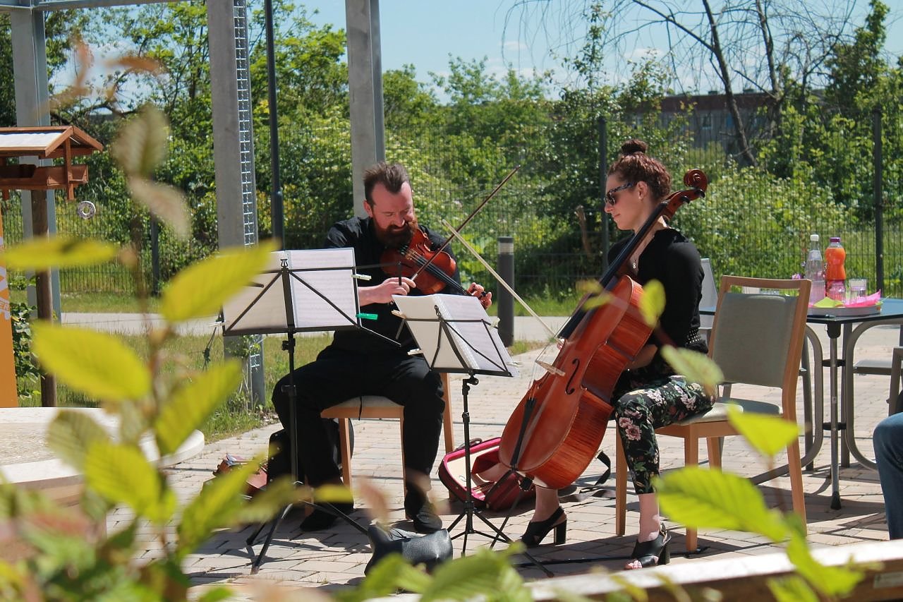 Ein Highlight im Mai, war das von den Mitgliedern des Rotary Clubs initiierte Gartenkonzert, was von unseren Bewohnerinnen und Bewohnern in Vorfreude erwartet wurde. Gern stellten Titus Wabersich und Johann Gerhardt die beiden für dieses Projekt gewonnenen Künstler vor. Melissa Hart spielt Violoncello am Philharmonischen Orchester Erfurt und Artur Hubert Bratsche beim Loh - Orchester Sondershausen. Auf ihrer Tournee durch regionale Seniorenheime, machten sie am 28.05. auch am DRK Pflegeheim am Marienweg Halt und präsentierten ein abwechslungsreiches Programm mit bekannten klassischen Musikstücken. Durch die wunderbare Akustik des Gartens konnten die Klänge der Instrumente auch auf den oberen Etagen gut vernommen werden. Unsere Bewohnerinnen und Bewohner hörten von ihren Terrassen aus gebannt zu und klatschten begeistert Beifall. In nachfolgenden Reflexionsgesprächen mit Ihnen, unterstrichen Äußerungen wie: Man hätte eine Stecknadel fallen hören können, so interessiert waren alle., Das war eine Gänsehaut – Atmosphäre., Tolle Abwechslung. Eine gute Idee., Es war ein wunderschöner Nachmittag. die positive Resonanz bezüglich dieses Projektes.