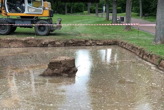 Doch anscheinend war dies nicht genug. Die anliegenden Lindenbäume zeigen derzeit leider nicht ihr frisches Kleid aus saftigen grünen Blättern. Um den Bäumen zu helfen, wurde nun der gesamte Bereich nochmals ausgebaggert.