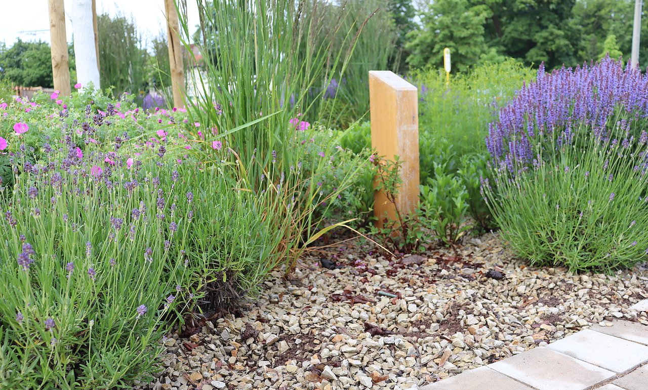 Die Stauden wurde während der Anwachsphase durch einen Bauzaun gesichert, dieser wurde erst vor kurzem entfernt, da die Pflanzen fest eingewachsen waren.